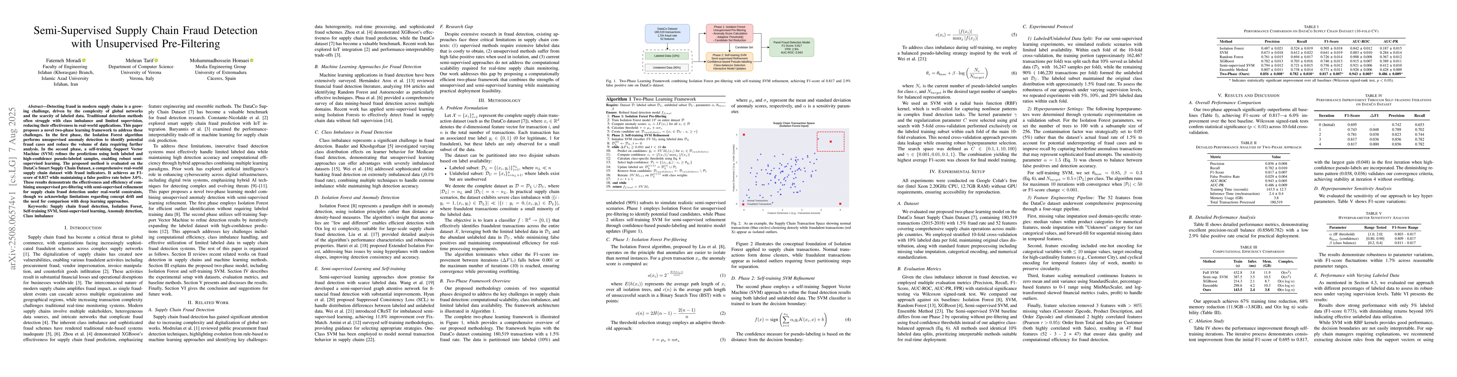 Detecting fraud in modern supply chains is a growing challenge, driven by the complexity of global networks and the scarcity of labeled data. Traditional detection methods often struggle with class imbalance and limited supervision, reducing their effectiveness in real-world applications. This paper proposes a novel two-phase learning framework to address these challenges. In the first phase, the Isolation Forest algorithm performs unsupervised anomaly detection to identify potential fraud cases and reduce the volume of data requiring further analysis. In the second phase, a self-training Support Vector Machine (SVM) refines the predictions using both labeled and high-confidence pseudo-labeled samples, enabling robust semi-supervised learning. The proposed method is evaluated on the DataCo Smart Supply Chain Dataset, a comprehensive real-world supply chain dataset with fraud indicators. It achieves an F1-score of 0.817 while maintaining a false positive rate below 3.0%. These results demonstrate the effectiveness and efficiency of combining unsupervised pre-filtering with semi-supervised refinement for supply chain fraud detection under real-world constraints, though we acknowledge limitations regarding concept drift and the need for comparison with deep learning approaches.