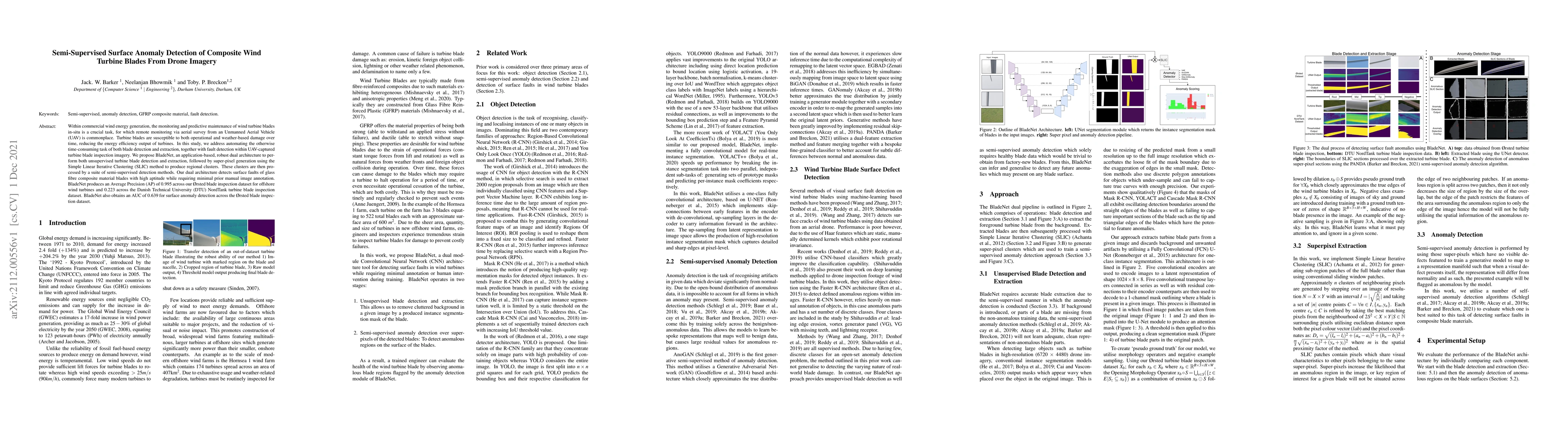 This research develops BladeNet, a dual architecture for semi-supervised surface anomaly detection on composite wind turbine blades from drone imagery, achieving high precision and accuracy in fault detection with minimal manual annotations. The system combines unsupervised blade detection, super-pixel clustering, and semi-supervised detection methods for effective maintenance monitoring.