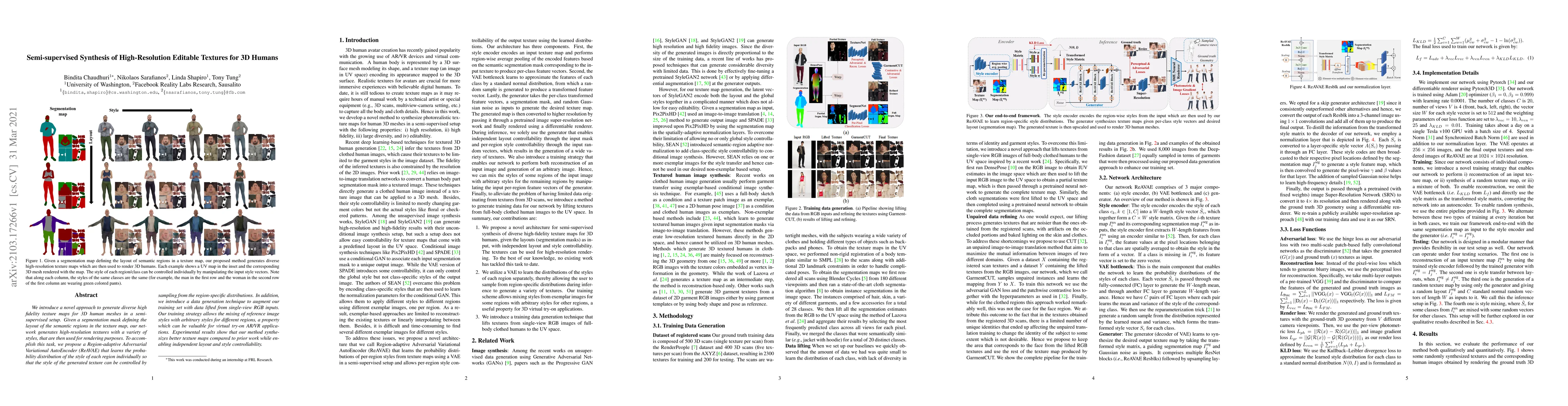 We introduce a novel approach to generate diverse high fidelity texture maps for 3D human meshes in a semi-supervised setup. Given a segmentation mask defining the layout of the semantic regions in the texture map, our network generates high-resolution textures with a variety of styles, that are then used for rendering purposes. To accomplish this task, we propose a Region-adaptive Adversarial Variational AutoEncoder (ReAVAE) that learns the probability distribution of the style of each region individually so that the style of the generated texture can be controlled by sampling from the region-specific distributions. In addition, we introduce a data generation technique to augment our training set with data lifted from single-view RGB inputs. Our training strategy allows the mixing of reference image styles with arbitrary styles for different regions, a property which can be valuable for virtual try-on AR/VR applications. Experimental results show that our method synthesizes better texture maps compared to prior work while enabling independent layout and style controllability.