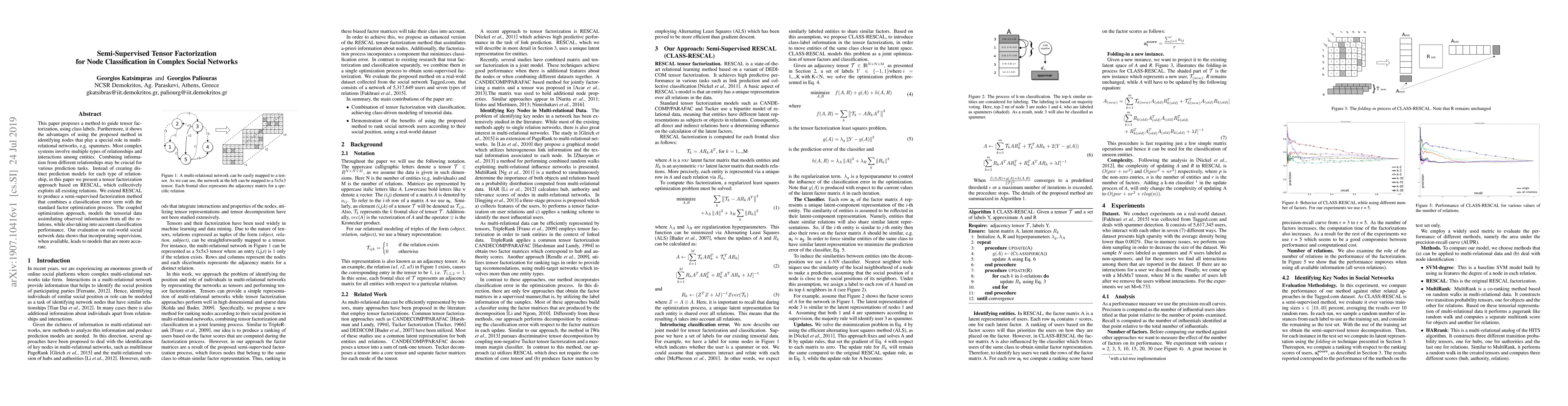 This paper introduces a semi-supervised tensor factorization method for node classification in complex social networks, leveraging multiple relationship types. The approach, an extension of RESCAL, combines a classification error term with standard tensor optimization, improving prediction accuracy when class labels are available.