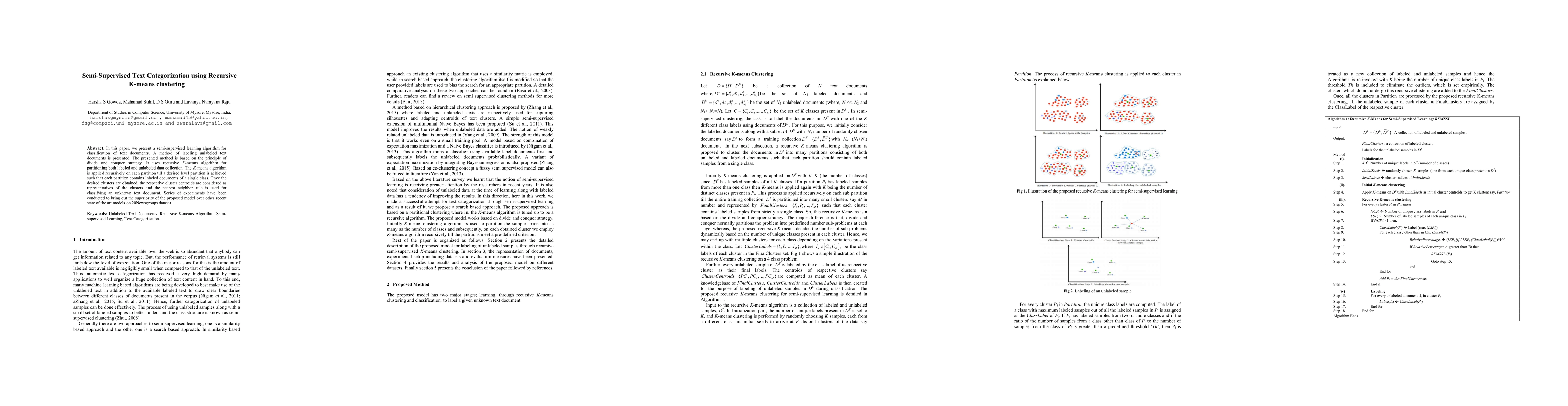 This paper proposes a semi-supervised text categorization method using recursive K-means clustering, which iteratively partitions labeled and unlabeled data to achieve single-class clusters. The cluster centroids are used to classify unknown documents, demonstrating superior performance over other models on the 20Newsgroups dataset.