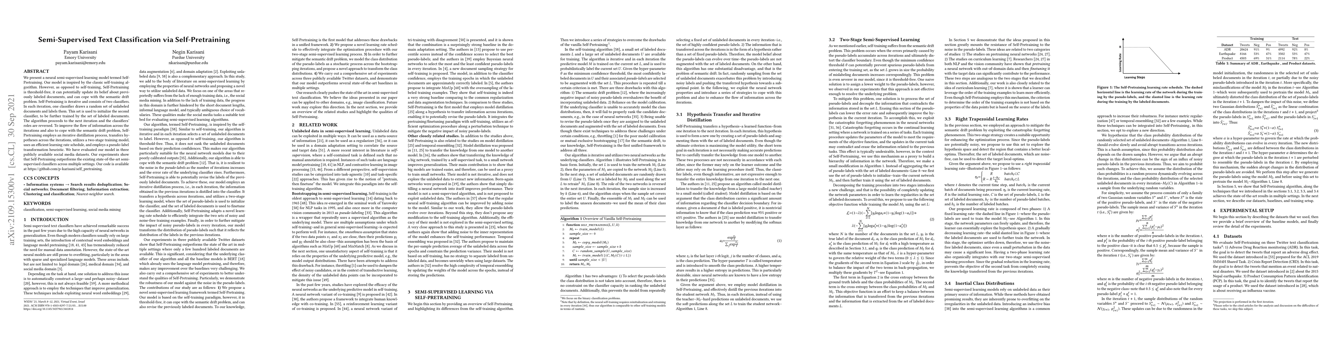 This paper introduces Self-Pretraining, a neural semi-supervised learning model that iteratively updates its classifiers to improve text classification, outperforming existing state-of-the-art methods. The model employs an iterative distillation process and pseudo-label transformation to handle semantic drift and enhance performance.