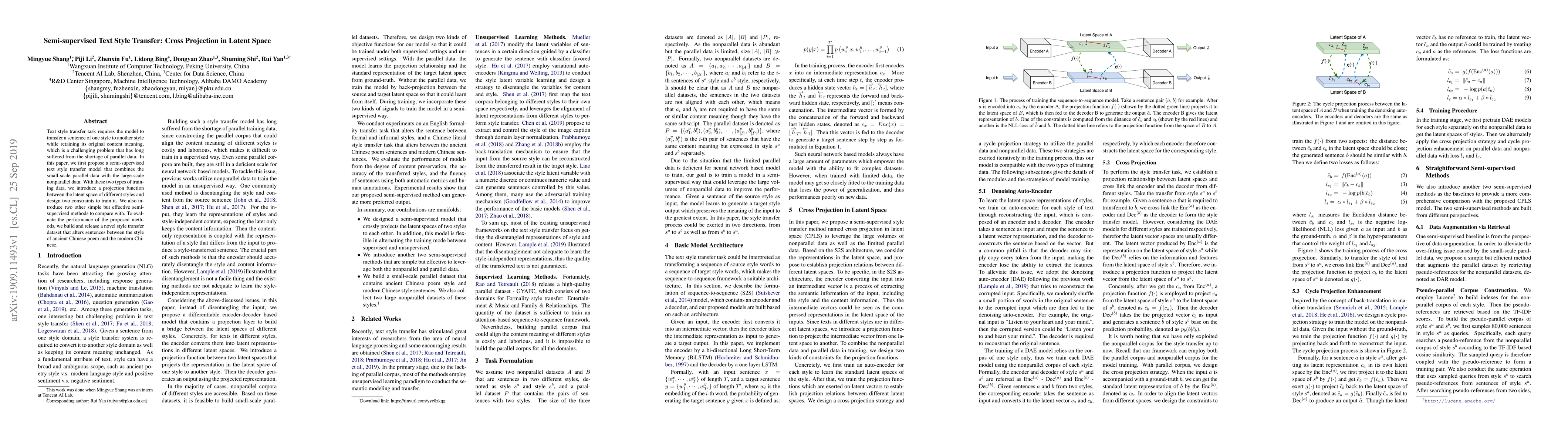 This paper proposes a semi-supervised text style transfer model that leverages both small-scale parallel and large-scale nonparallel data, employing a cross projection in latent space and two training constraints. It also introduces additional semi-supervised methods for comparison and releases a new dataset for evaluating style transfer between ancient and modern Chinese.