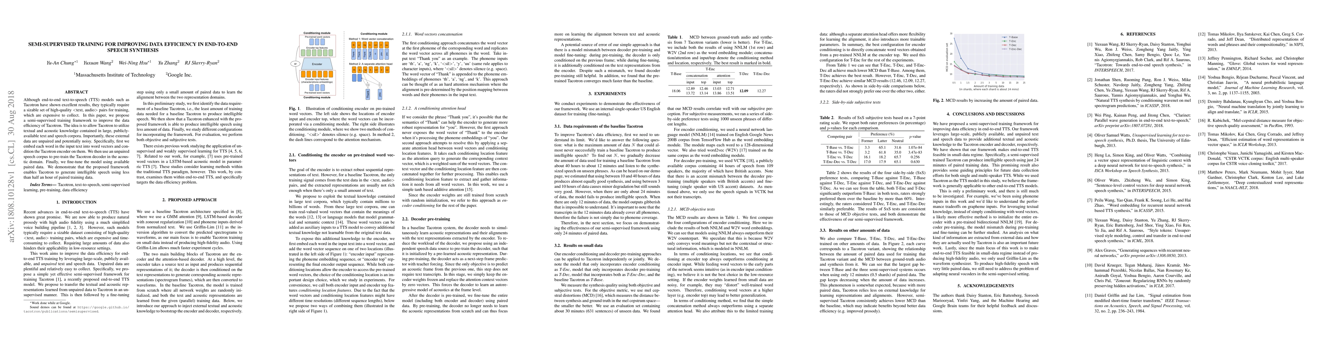This paper proposes a semi-supervised training framework to enhance the data efficiency of Tacotron, an end-to-end text-to-speech model, by leveraging large, unpaired text and speech corpora. The approach enables Tacotron to generate intelligible speech using significantly less paired training data.