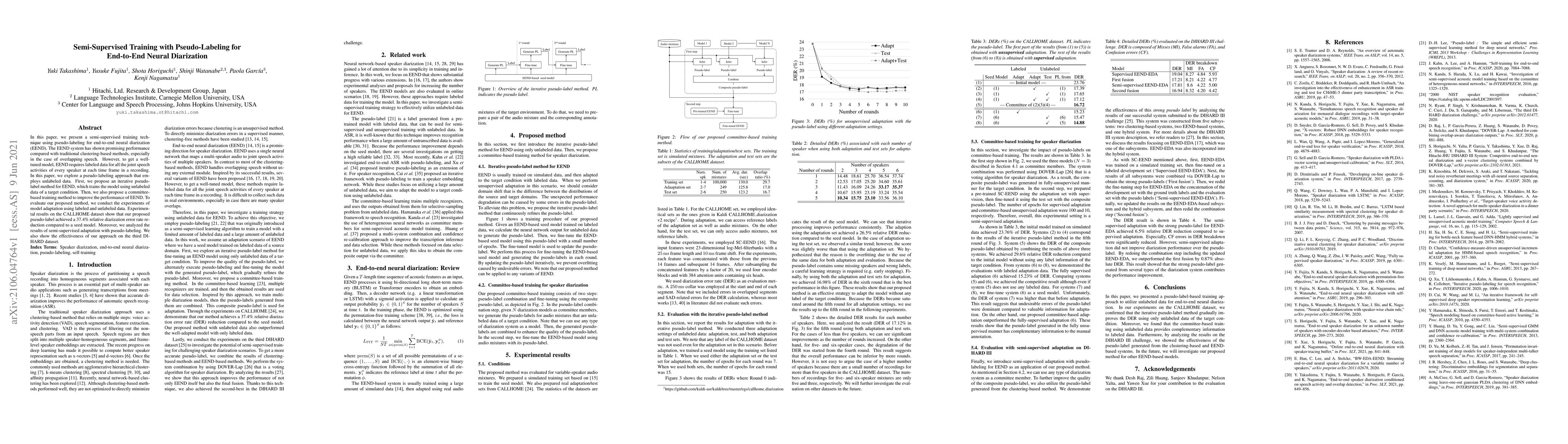 This paper introduces a semi-supervised training technique for end-to-end neural diarization (EEND) using pseudo-labeling, which reduces diarization error rate by 37.4% compared to a seed model on the CALLHOME dataset. The method, involving iterative pseudo-labeling and committee-based training, also demonstrates effectiveness on the DIHARD dataset.