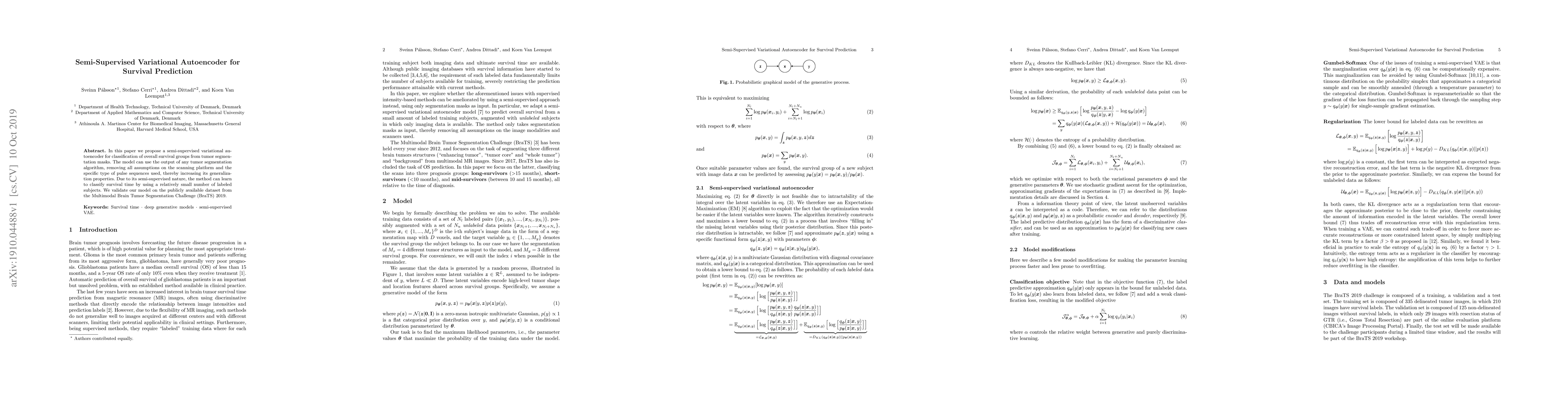 This paper introduces a semi-supervised variational autoencoder for classifying overall survival groups from tumor segmentation masks, demonstrating its effectiveness with minimal assumptions on scanning platforms. The model's ability to work with a small number of labeled data points is validated using the BraTS 2019 dataset.