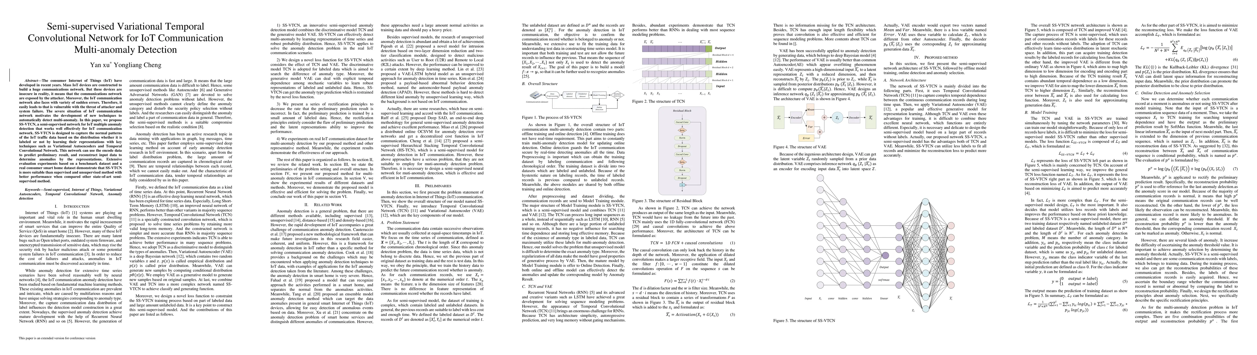 This paper proposes SS-VTCN, a semi-supervised Variational Temporal Convolutional Network for detecting multiple anomalies in IoT communication networks. The network leverages Variational Autoencoders and Temporal Convolutional Networks to learn representations of IoT traffic data, enabling effective anomaly detection with both labeled and unlabeled data.