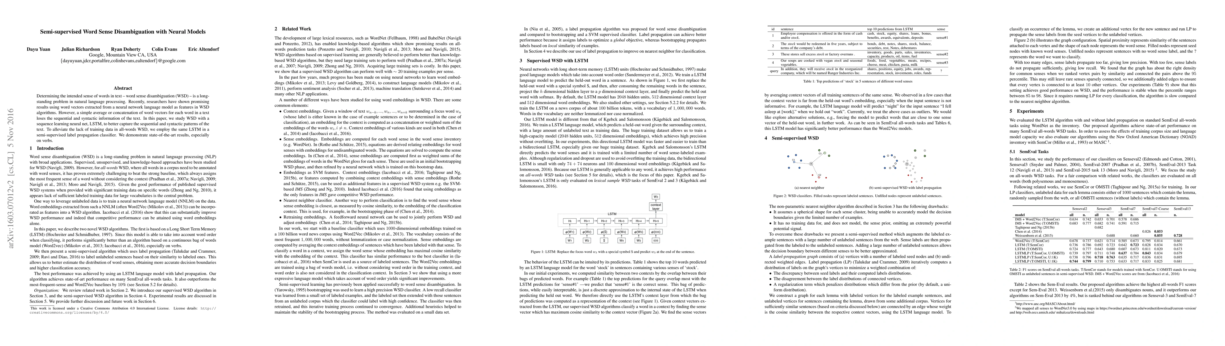 This paper proposes using an LSTM neural network for word sense disambiguation (WSD) to better capture text's sequential and syntactic patterns. It employs a semi-supervised label propagation approach to address the scarcity of training data, achieving state-of-the-art results particularly for verbs.