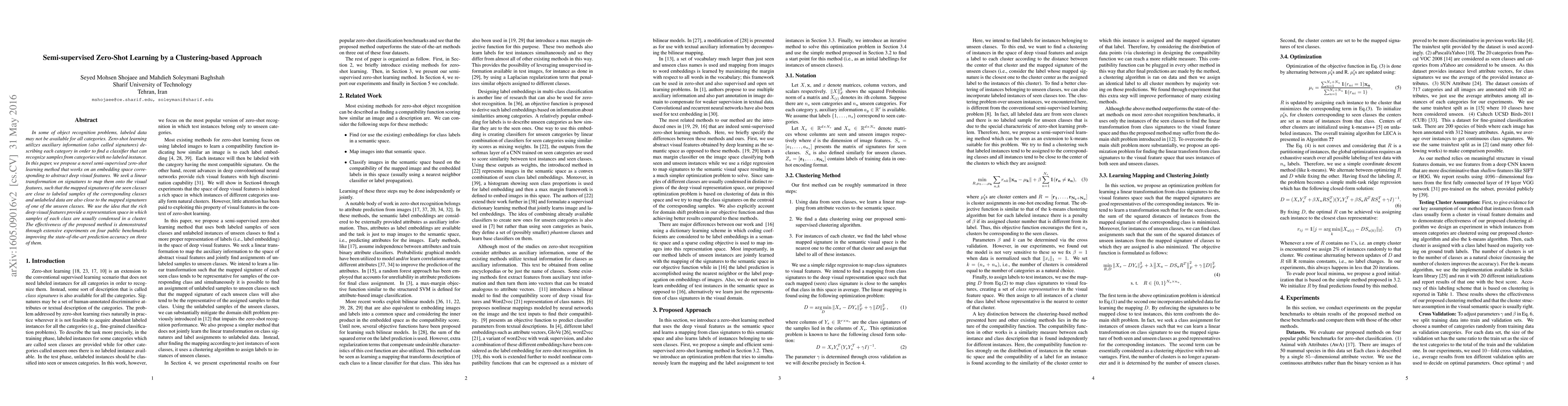 A new method for semi-supervised zero-shot learning is proposed, using clustering to map auxiliary signatures onto deep visual features, improving state-of-the-art prediction accuracy on three public benchmarks.