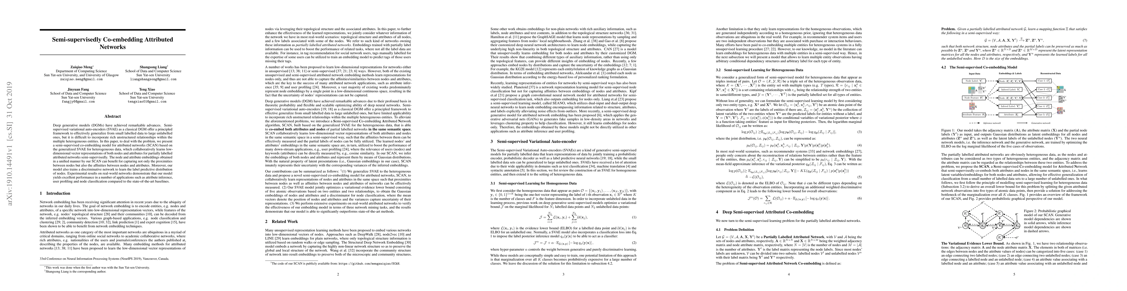 This paper introduces a semi-supervised co-embedding model (SCAN) for attributed networks based on generalized semi-supervised variational auto-encoders, which jointly learns representations of nodes and attributes to capture relationships in partially labelled networks, achieving superior performance in attribute inference, user profiling, and node classification.