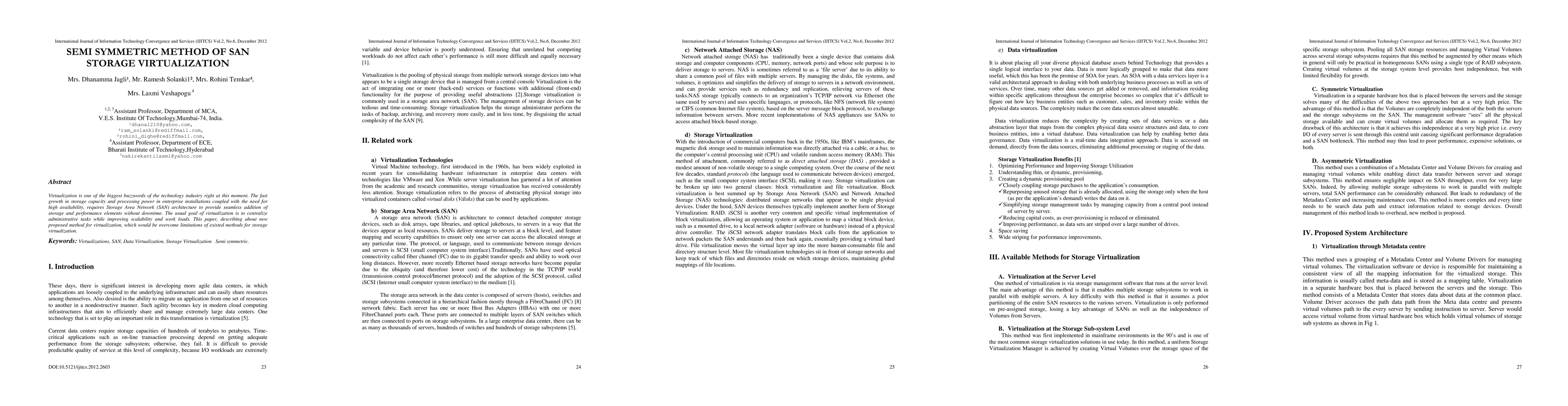 This paper introduces a semi-symmetric method for SAN storage virtualization aiming to enhance scalability and high availability while overcoming limitations of existing virtualization techniques. The proposed method centralizes administrative tasks and improves performance without downtime.