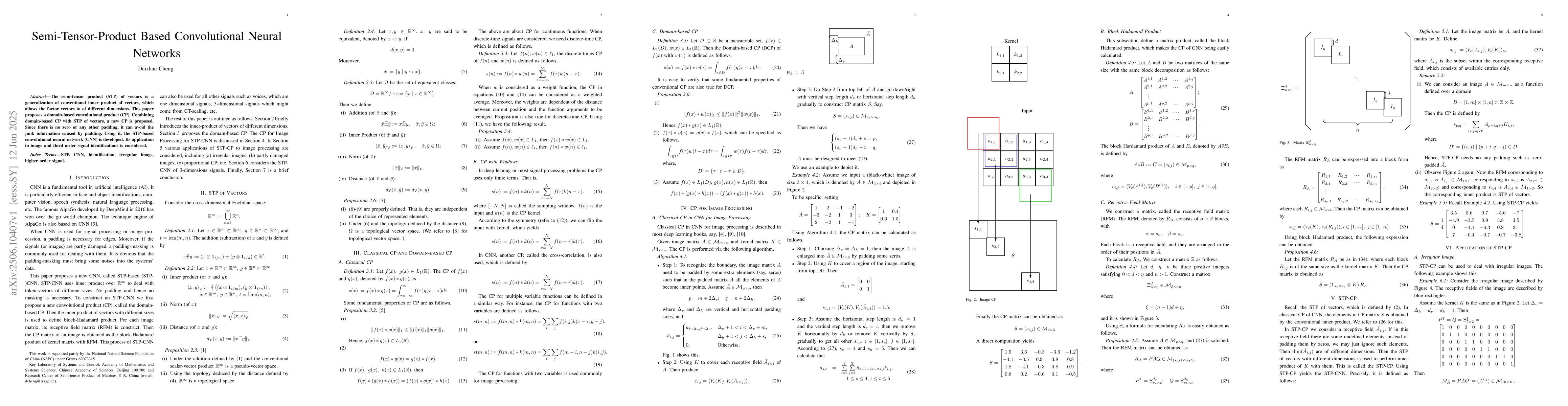 The semi-tensor product (STP) of vectors is a generalization of conventional inner product of vectors, which allows the factor vectors to of different dimensions. This paper proposes a domain-based convolutional product (CP). Combining domain-based CP with STP of vectors, a new CP is proposed. Since there is no zero or any other padding, it can avoid the junk information caused by padding. Using it, the STP-based convolutional neural network (CNN) is developed. Its application to image and third order signal identifications is considered.
