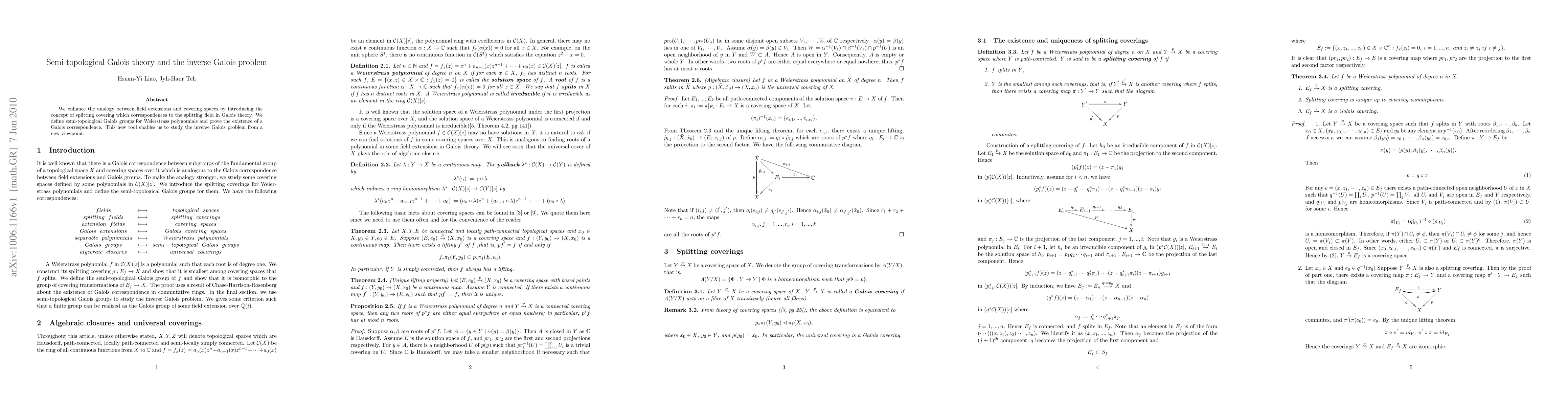 This paper introduces semi-topological Galois theory, linking field extensions with covering spaces using the concept of splitting coverings, and defines semi-topological Galois groups for Weierstrass polynomials, establishing a Galois correspondence to tackle the inverse Galois problem.