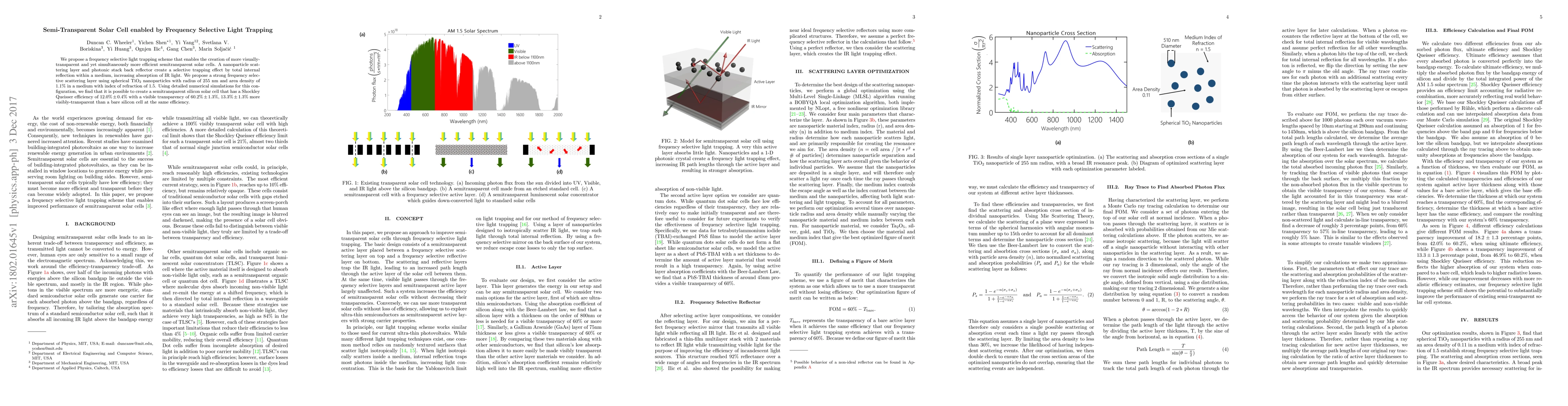 This paper proposes a frequency selective light trapping method to enhance the efficiency and transparency of semitransparent solar cells. By using a scattering layer of TiO2 nanoparticles and a photonic stack back reflector, the design achieves a balance of 12.0% efficiency and 60.2% visible transparency, significantly outperforming bare silicon cells.