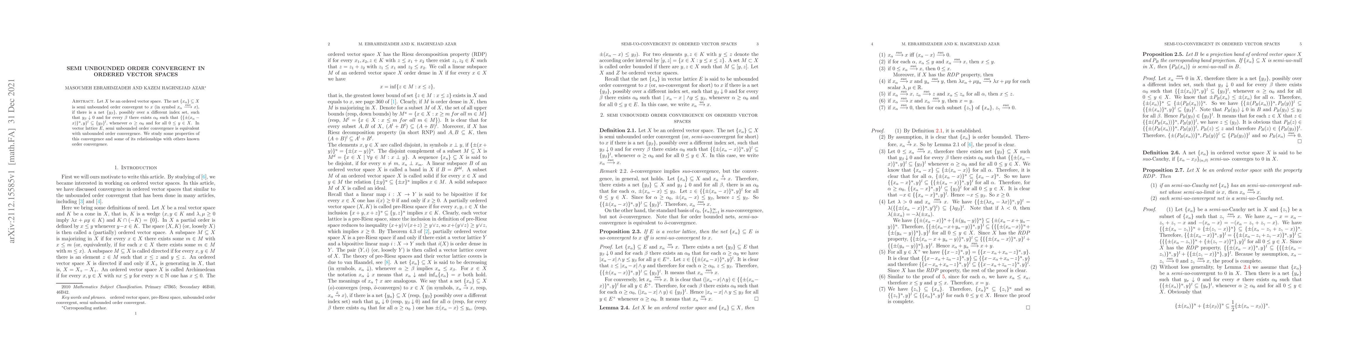The paper defines semi unbounded order convergence in ordered vector spaces and explores its properties, showing that in vector lattices, it is equivalent to unbounded order convergence. It also examines its relationship with other known types of order convergence.