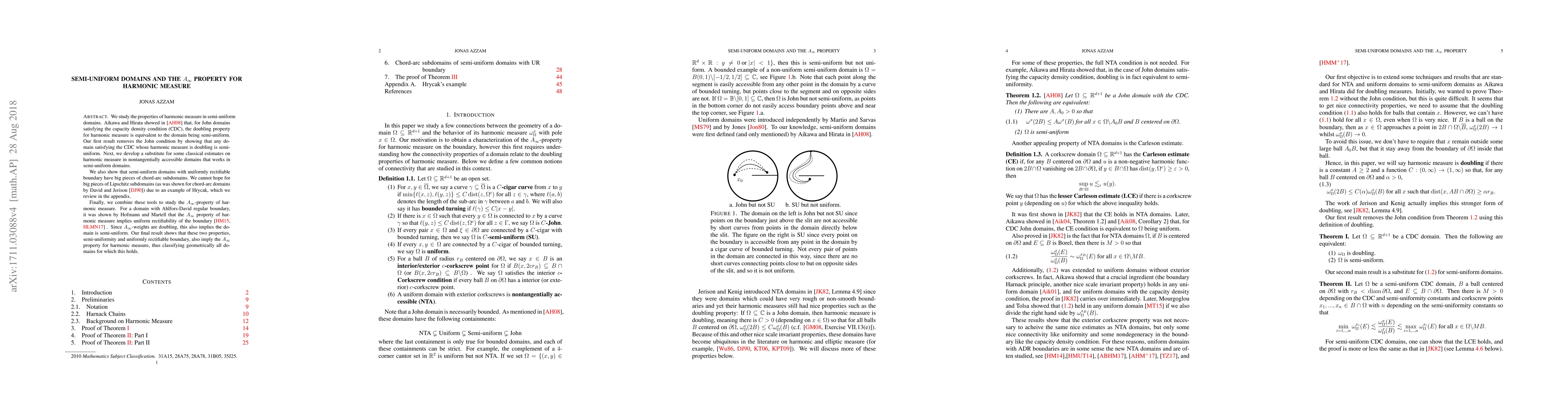 This paper investigates the properties of harmonic measure in semi-uniform domains, proving that domains satisfying the capacity density condition with doubling harmonic measure are semi-uniform. It also establishes the presence of chord-arc subdomains in semi-uniform domains with uniformly rectifiable boundaries and classifies domains with semi-uniformity and uniformly rectifiable boundaries as having the $A_{\infty}$ property for harmonic measure.