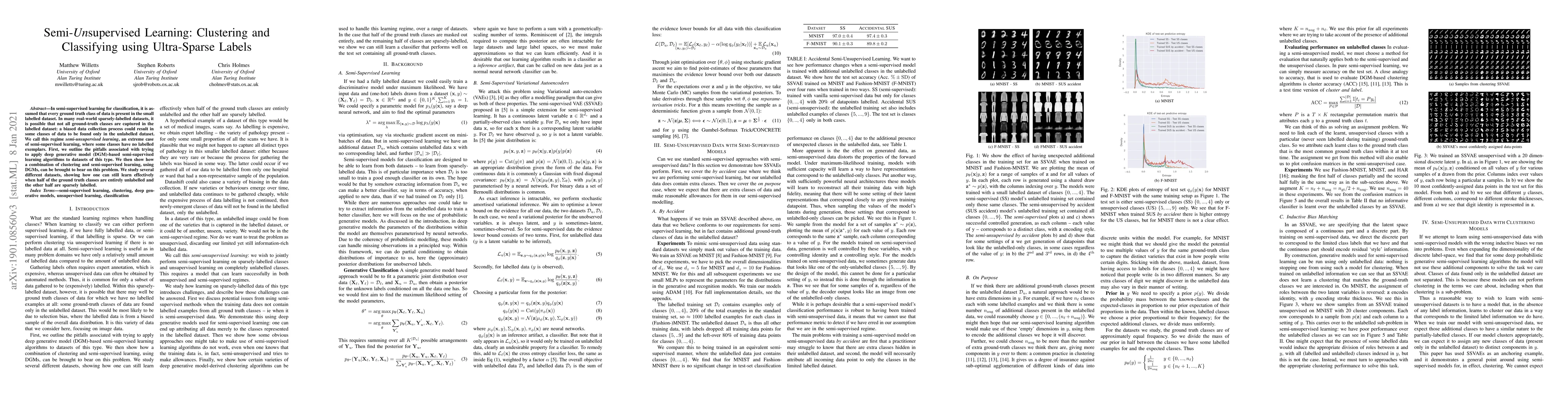 In semi-supervised learning for classification, it is assumed that every ground truth class of data is present in the small labelled dataset. Many real-world sparsely-labelled datasets are plausibly not of this type. It could easily be the case that some classes of data are found only in the unlabelled dataset -- perhaps the labelling process was biased -- so we do not have any labelled examples to train on for some classes. We call this learning regime $\textit{semi-unsupervised learning}$, an extreme case of semi-supervised learning, where some classes have no labelled exemplars in the training set. First, we outline the pitfalls associated with trying to apply deep generative model (DGM)-based semi-supervised learning algorithms to datasets of this type. We then show how a combination of clustering and semi-supervised learning, using DGMs, can be brought to bear on this problem. We study several different datasets, showing how one can still learn effectively when half of the ground truth classes are entirely unlabelled and the other half are sparsely labelled.