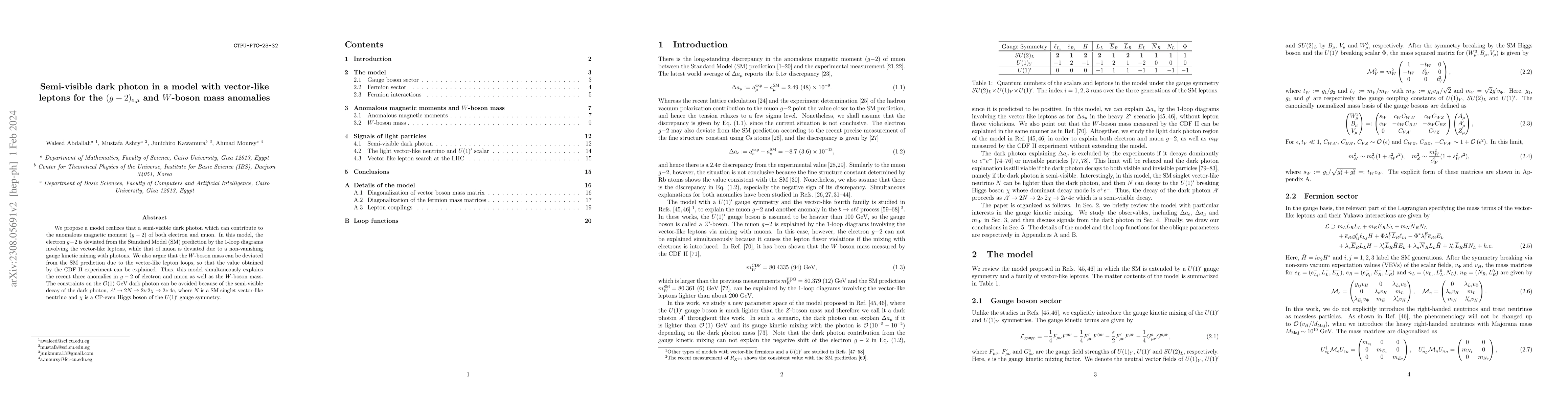 We propose a model realizes that a semi-visible dark photon which can contribute to the anomalous magnetic moment ($g-2$) of both electron and muon. In this model, the electron $g-2$ is deviated from the Standard Model (SM) prediction by the 1-loop diagrams involving the vector-like leptons, while that of muon is deviated due to a non-vanishing gauge kinetic mixing with photons. We also argue that the $W$-boson mass can be deviated from the SM prediction due to the vector-like lepton loops, so that the value obtained by the CDF II experiment can be explained. Thus, this model simultaneously explains the recent three anomalies in $g-2$ of electron and muon as well as the $W$-boson mass. The constraints on the $\mathcal{O}(1)~\mathrm{GeV}$ dark photon can be avoided because of the semi-invisible decay of the dark photon, $A^\prime \to 2 N \to 2\nu \,2\chi \to 2\nu \,4e$, where $N$ is a SM singlet vector-like neutrino and $\chi$ is a CP-even Higgs boson of the $U(1)^\prime$ gauge symmetry.
