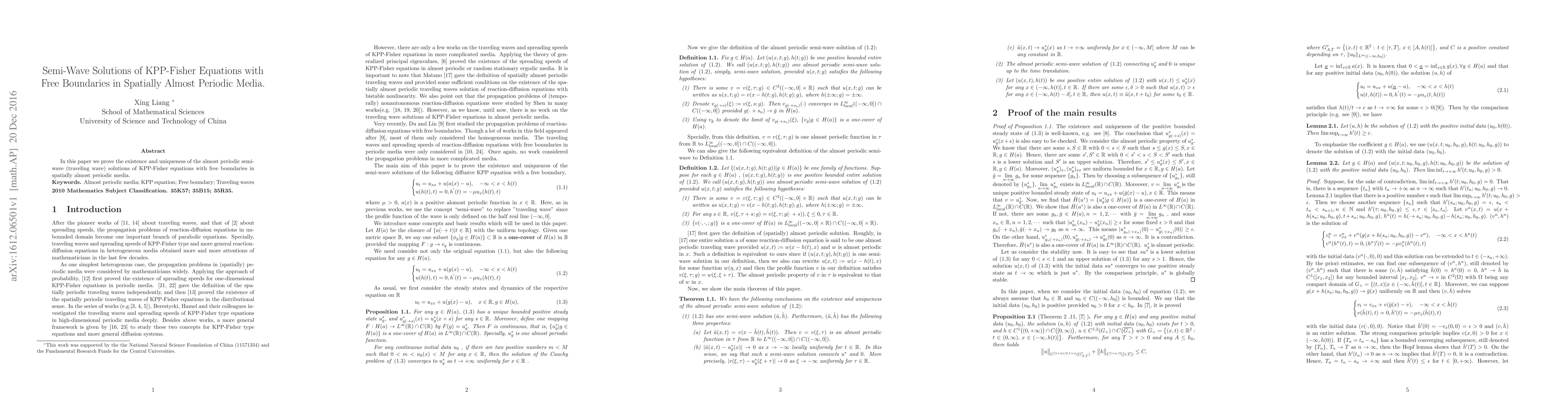 Summary: This paper establishes the existence and uniqueness of almost periodic semi-wave solutions for KPP-Fisher equations featuring free boundaries in spatially almost periodic environments. The study focuses on the dynamics of these solutions within the specified media.