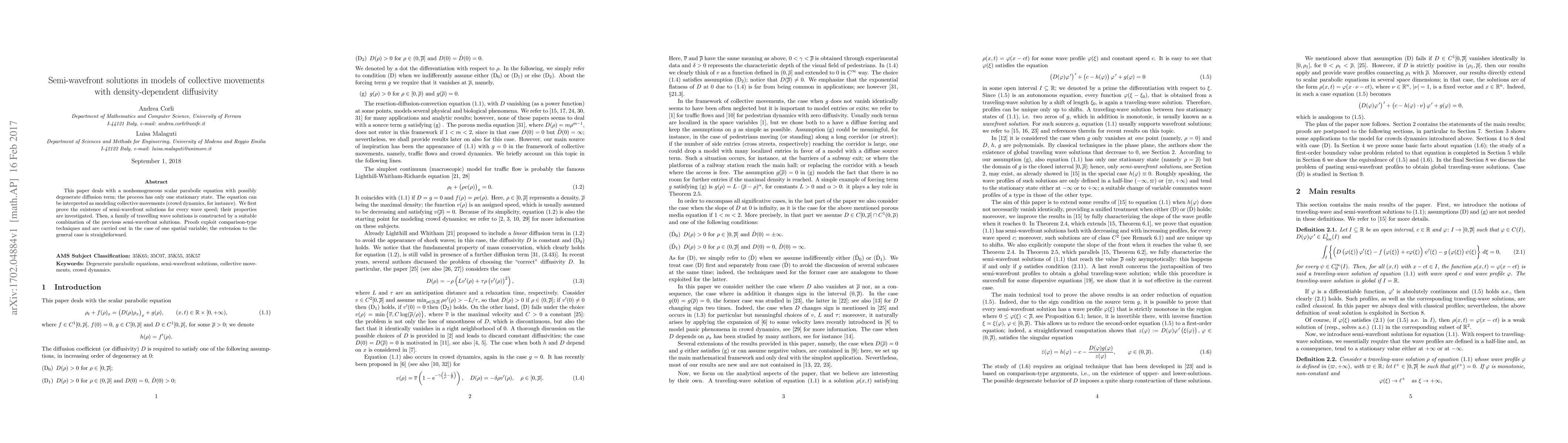 This paper investigates semi-wavefront solutions for a model of collective movements with density-dependent diffusivity, showing that such solutions exist for every wave speed and enabling the construction of travelling wave solutions.