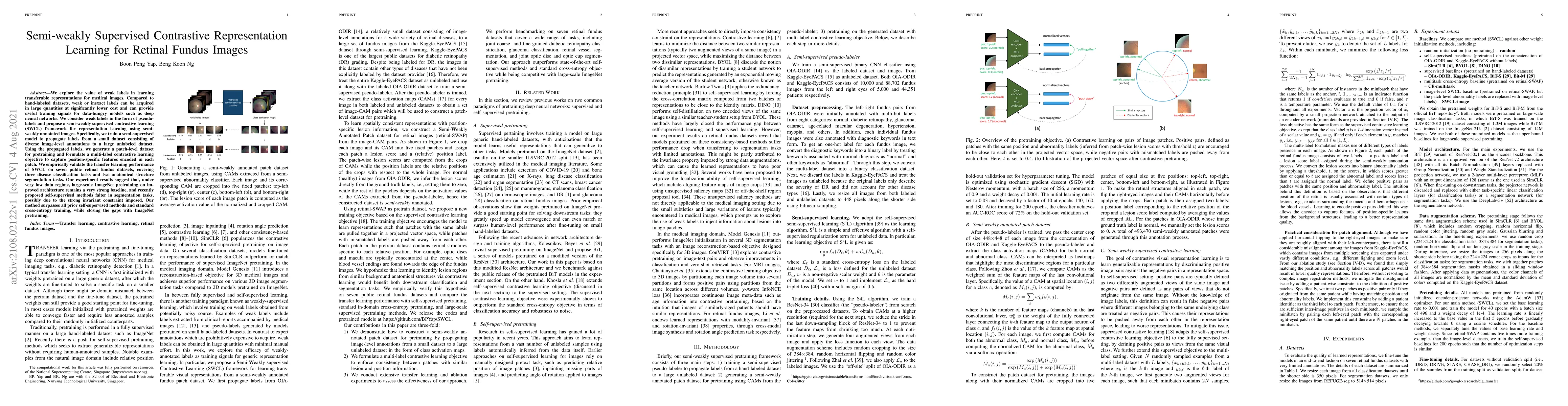 This paper proposes a semi-weakly supervised contrastive learning framework (SWCL) to leverage weak labels for learning representations from retinal fundus images. The method outperforms prior self-supervised methods and standard cross-entropy training, especially in low-data regimes, while closing the performance gap with large-scale ImageNet pretraining.