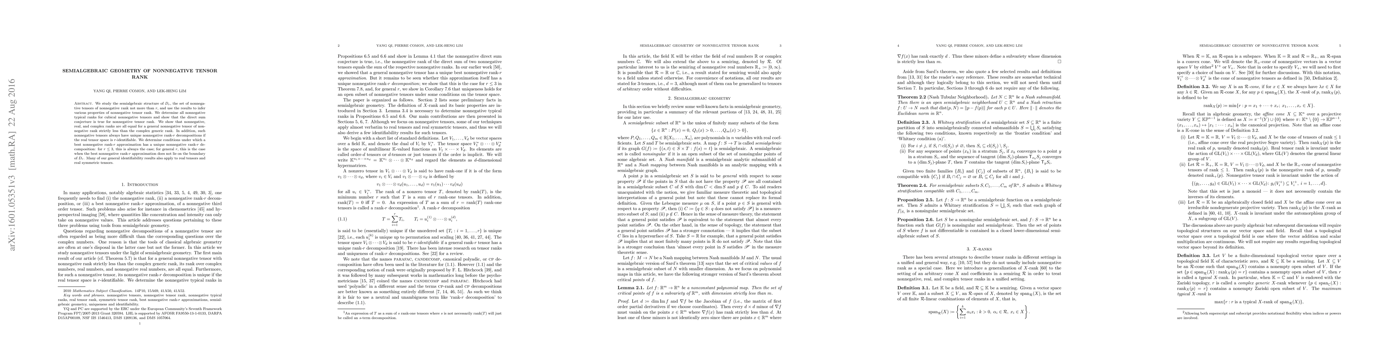 This paper investigates the semialgebraic properties of nonnegative tensors of rank up to $r$, determining typical ranks for cubical tensors and proving the direct sum conjecture for nonnegative tensor rank. It also establishes the equality of nonnegative, real, and complex ranks for general tensors below the complex generic rank and identifies conditions for unique nonnegative rank-$r$ decompositions.