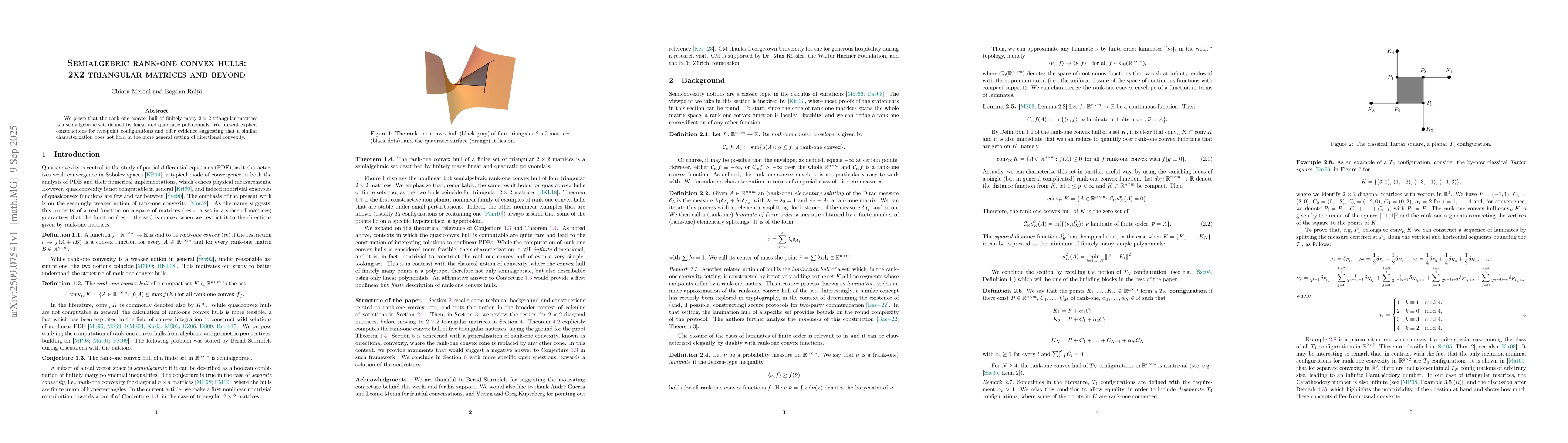 We prove that the rank-one convex hull of finitely many $2\times 2$ triangular matrices is a semialgebraic set, defined by linear and quadratic polynomials. We present explicit constructions for five-point configurations and offer evidence suggesting that a similar characterization does not hold in the more general setting of directional convexity.