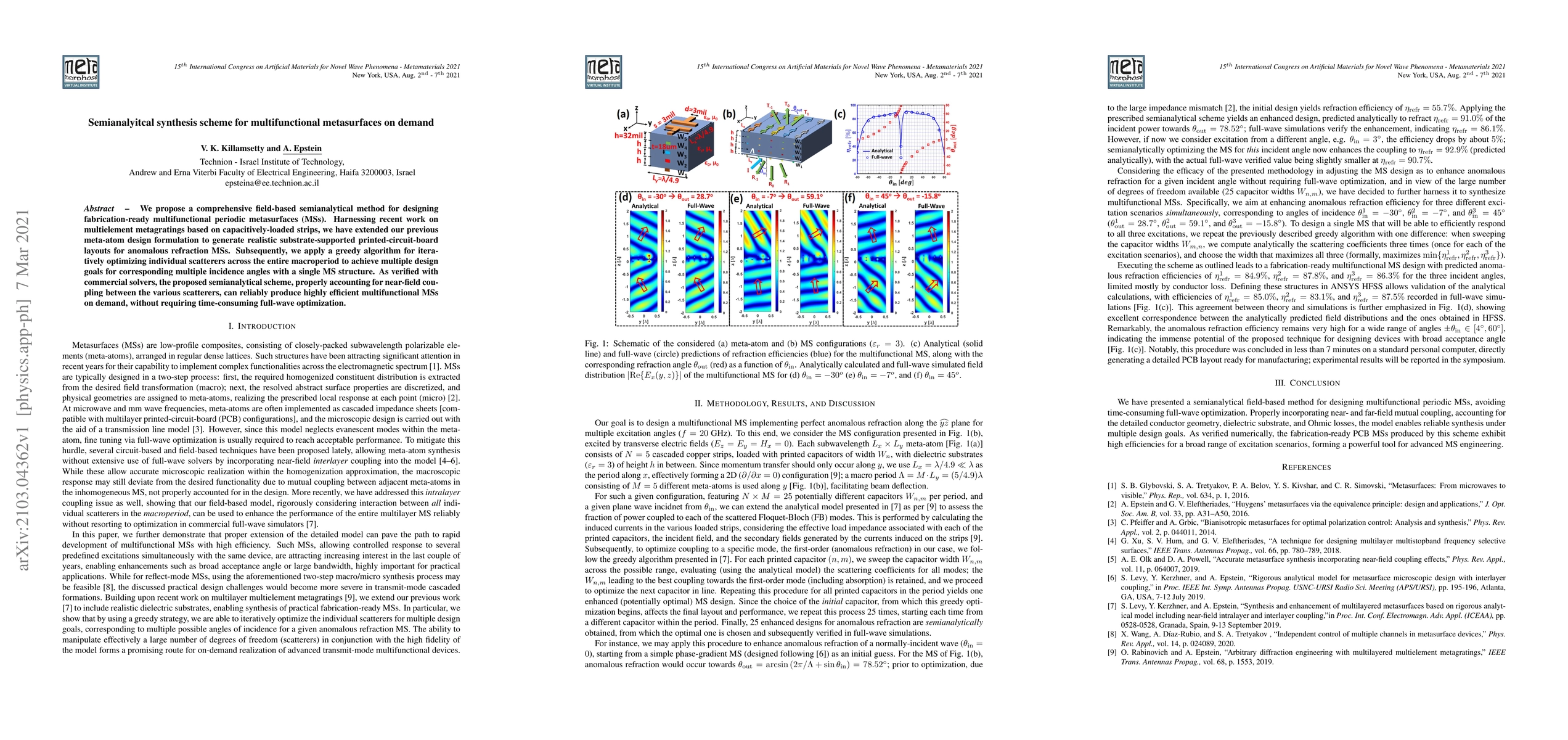 We propose a comprehensive field-based semianalytical method for designing fabrication-ready multifunctional periodic metasurfaces (MSs). Harnessing recent work on multielement metagratings based on capacitively-loaded strips, we have extended our previous meta-atom design formulation to generate realistic substrate-supported printed-circuit-board layouts for anomalous refraction MSs. Subsequently, we apply a greedy algorithm for iteratively optimizing individual scatterers across the entire macroperiod to achieve multiple design goals for corresponding multiple incidence angles with a single MS structure. As verified with commercial solvers, the proposed semianalytical scheme, properly accounting for near-field coupling between the various scatterers, can reliably produce highly efficient multifunctional MSs on demand, without requiring time-consuming full-wave optimization.