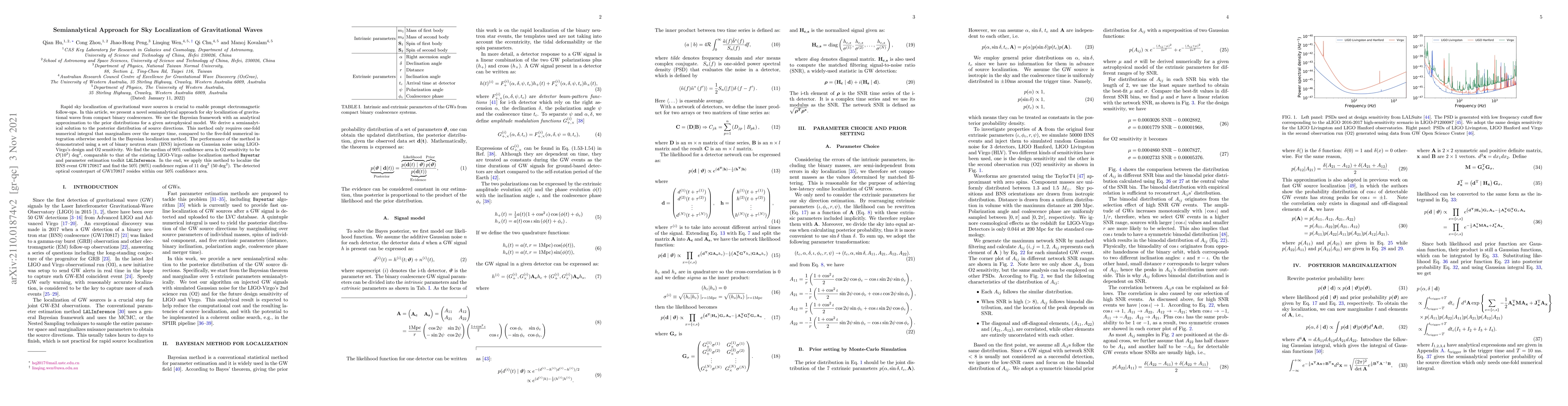 Rapid sky localization of gravitational wave sources is crucial to enable prompt electromagnetic follow-ups. In this article, we present a novel semianalytical approach for sky localization of gravitational waves from compact binary coalescences. We use the Bayesian framework with an analytical approximation to the prior distributions for a given astrophysical model. We derive a semianalytical solution to the posterior distribution of source directions. This method only requires one-fold numerical integral that marginalizes over the merger time, compared to the five-fold numerical integration otherwise needed in the Bayesian localization method. The performance of the method is demonstrated using a set of binary neutron stars (BNS) injections on Gaussian noise using LIGO-Virgo's design and O2 sensitivity. We find the median of 90% confidence area in O2 sensitivity to be $\mathcal{O}(10^2) ~\mathrm{deg}^2$, comparable to that of the existing LIGO-Virgo online localization method Bayestar and parameter estimation toolkit LALInference. In the end, we apply this method to localize the BNS event GW170817 and find the 50% (90%) confidence region of 11 $\mathrm{deg}^2$ (50 $\mathrm{deg}^2$). The detected optical counterpart of GW170817 resides within our 50% confidence area.