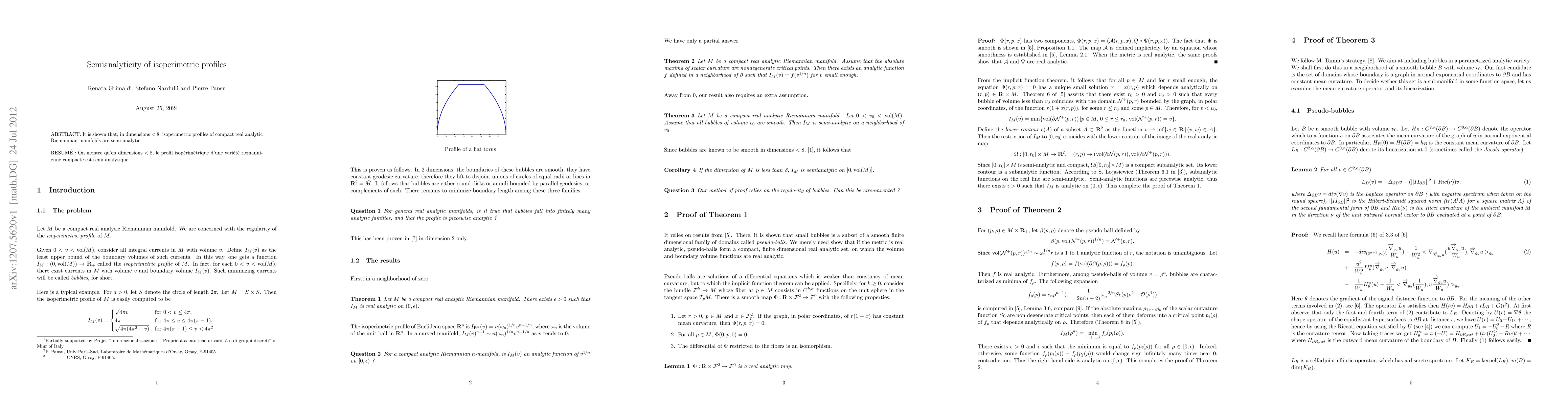 Summary: The paper demonstrates that isoperimetric profiles of compact real analytic Riemannian manifolds exhibit semianalyticity in dimensions less than 8. This result provides insight into the geometric properties of these manifolds.