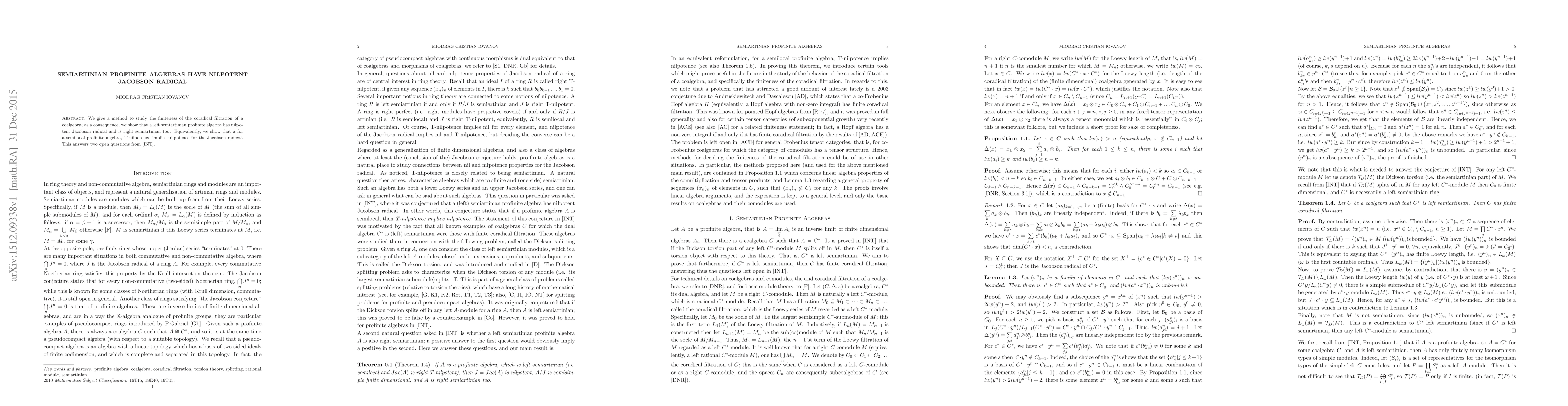 This paper demonstrates that left semiartinian profinite algebras have a nilpotent Jacobson radical, providing a method to study the finiteness of the coradical filtration of coalgebras. It also resolves two open questions regarding T-nilpotence and nilpotence of the Jacobson radical in semilocal profinite algebras.