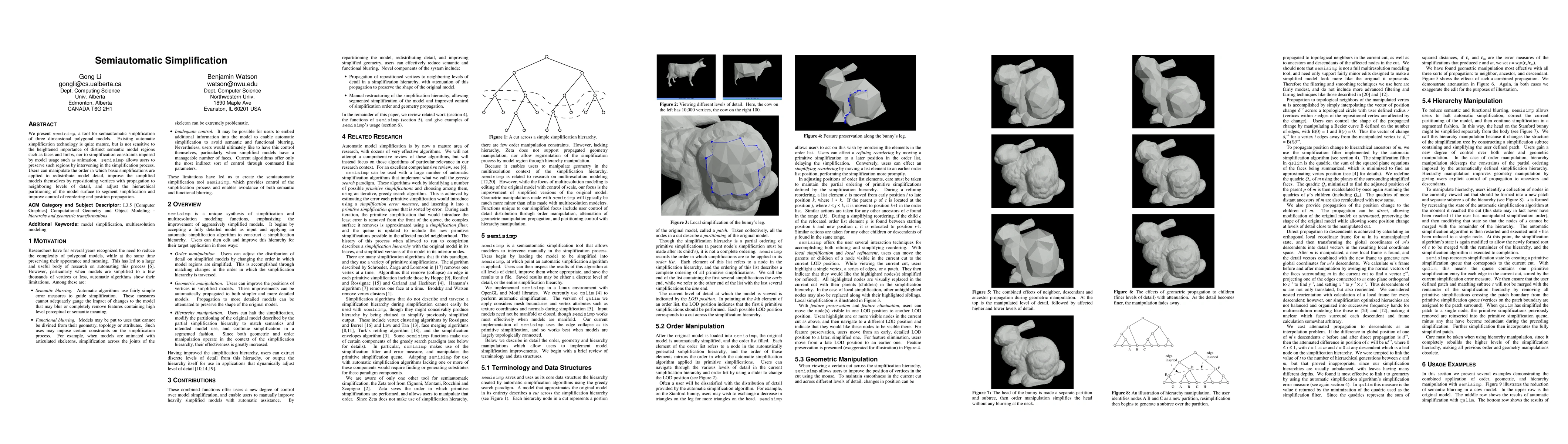 We present semisimp, a tool for semiautomatic simplification of three dimensional polygonal models. Existing automatic simplification technology is quite mature, but is not sensitive to the heightened importance of distinct semantic model regions such as faces and limbs, nor to simplification constraints imposed by model usage such as animation. semisimp allows users to preserve such regions by intervening in the simplification process. Users can manipulate the order in which basic simplifications are applied to redistribute model detail, improve the simplified models themselves by repositioning vertices with propagation to neighboring levels of detail, and adjust the hierarchical partitioning of the model surface to segment simplification and improve control of reordering and position propagation.