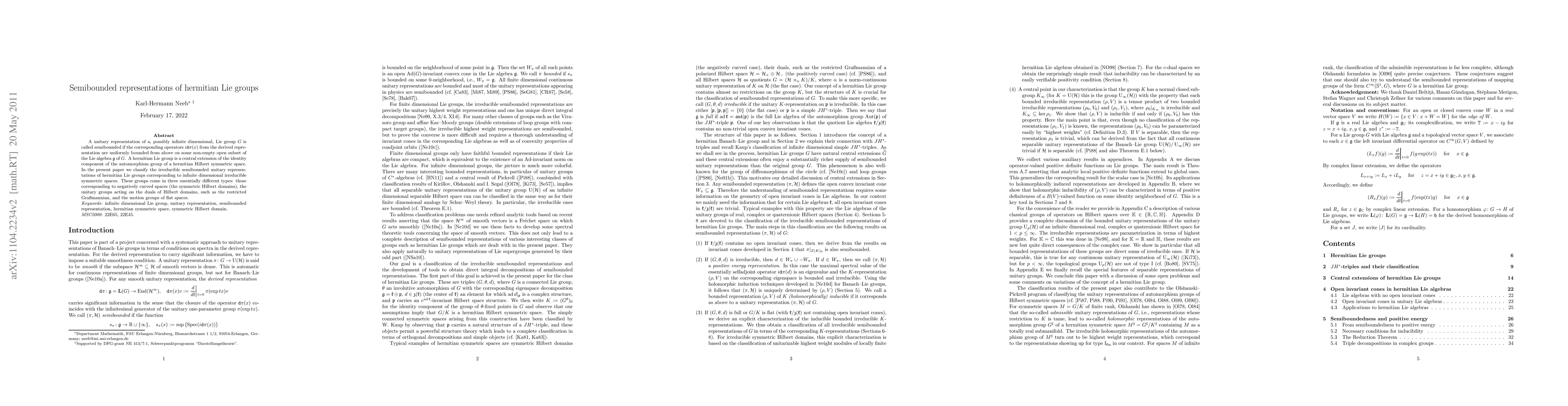 A unitary representation of a, possibly infinite dimensional, Lie group $G$ is called semibounded if the corresponding operators $i\dd\pi(x)$ from the derived representation are uniformly bounded from above on some non-empty open subset of the Lie algebra $\g$ of $G$. A hermitian Lie group is a central extension of the identity component of the automorphism group of a hermitian Hilbert symmetric space. In the present paper we classify the irreducible semibounded unitary representations of hermitian Lie groups corresponding to infinite dimensional irreducible symmetric spaces. These groups come in three essentially different types: those corresponding to negatively curved spaces (the symmetric Hilbert domains), the unitary groups acting on the duals of Hilbert domains, such as the restricted Gra\ss{}mannian, and the motion groups of flat spaces.