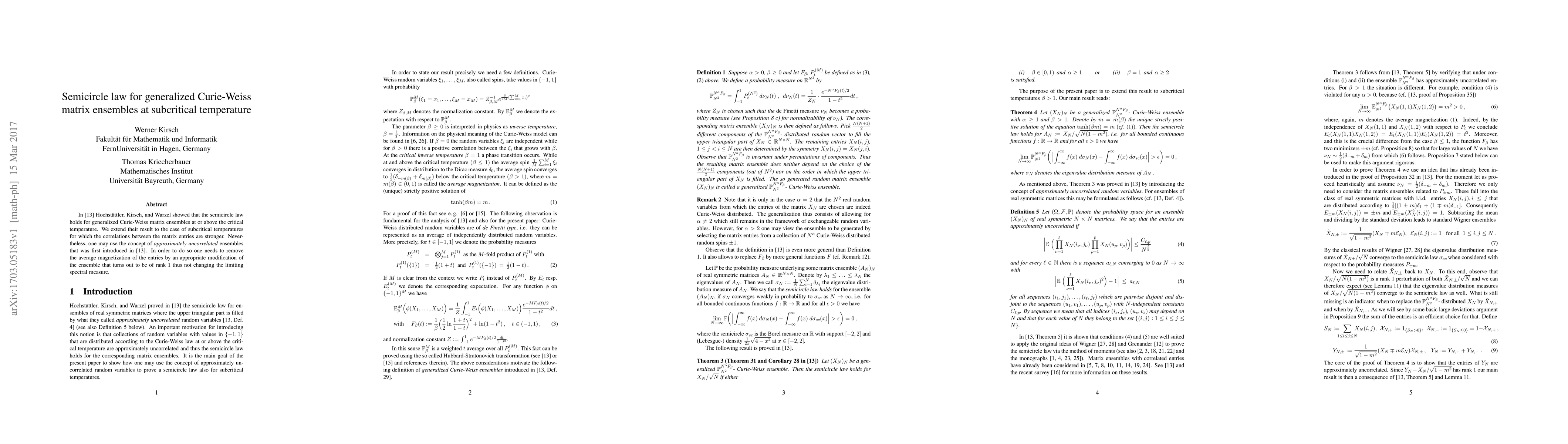 Summary: This paper extends the semicircle law to generalized Curie-Weiss matrix ensembles at subcritical temperatures, where stronger correlations exist. It utilizes the concept of approximately uncorrelated ensembles, achieved by modifying the ensemble to remove average magnetization, preserving the limiting spectral measure.