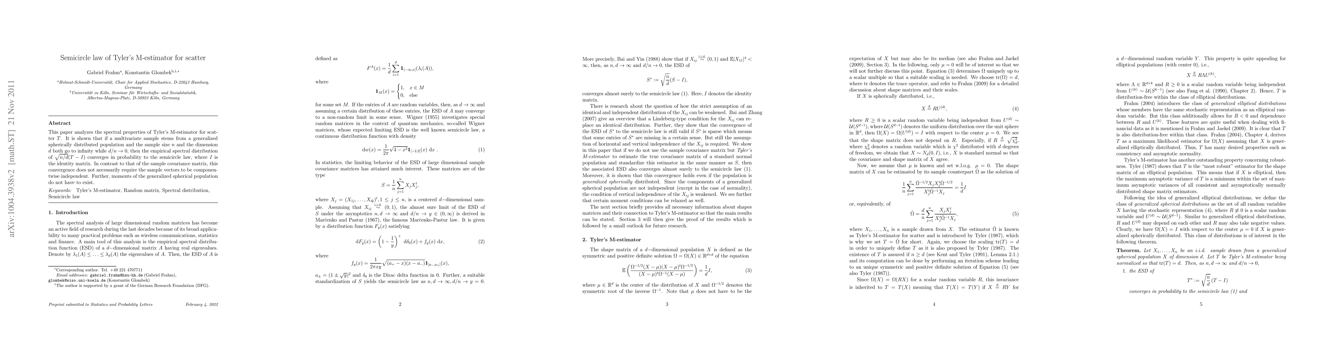 Summary: The paper demonstrates that the spectral distribution of Tyler's M-estimator for scatter converges in probability to the semicircle law, providing a significant result in the analysis of statistical estimators.