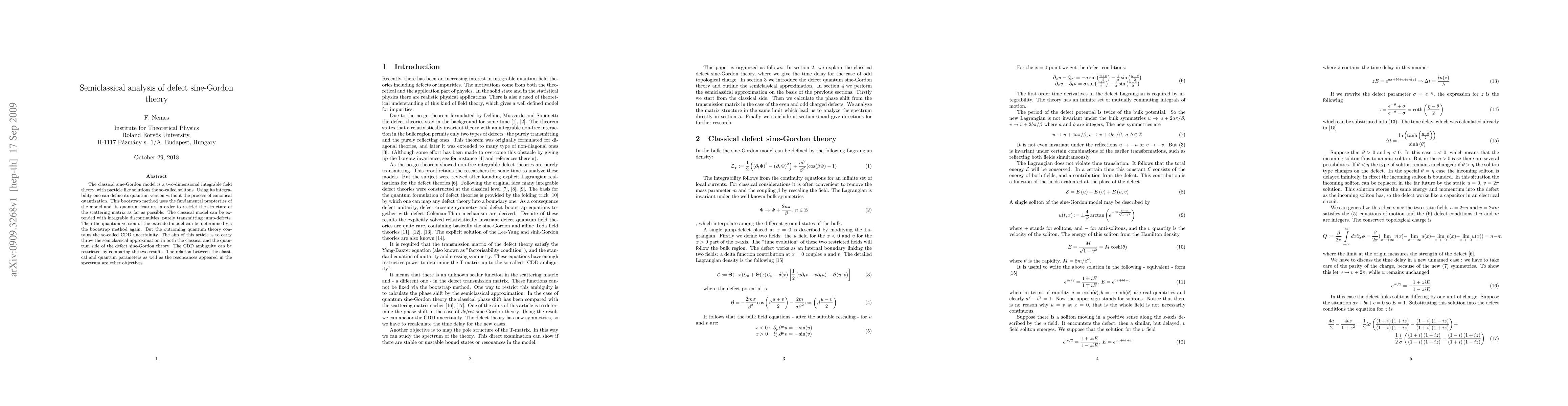The classical sine-Gordon model is a two-dimensional integrable field theory, with particle like solutions the so-called solitons. Using its integrability one can define its quantum version without the process of canonical quantization. This bootstrap method uses the fundamental propterties of the model and its quantum features in order to restrict the structure of the scattering matrix as far as possible. The classical model can be extended with integrable discontinuities, purely transmitting jump-defects. Then the quantum version of the extended model can be determined via the bootstrap method again. But the outcoming quantum theory contains the so-called CDD uncertainity. The aim of this article is to carry throw the semiclassical approximation in both the classical and the quantum side of the defect sine-Gordon theory. The CDD ambiguity can be restricted by comparing the two results. The relation between the classical and quantum parameters as well as the resoncances appeared in the spectrum are other objectives.