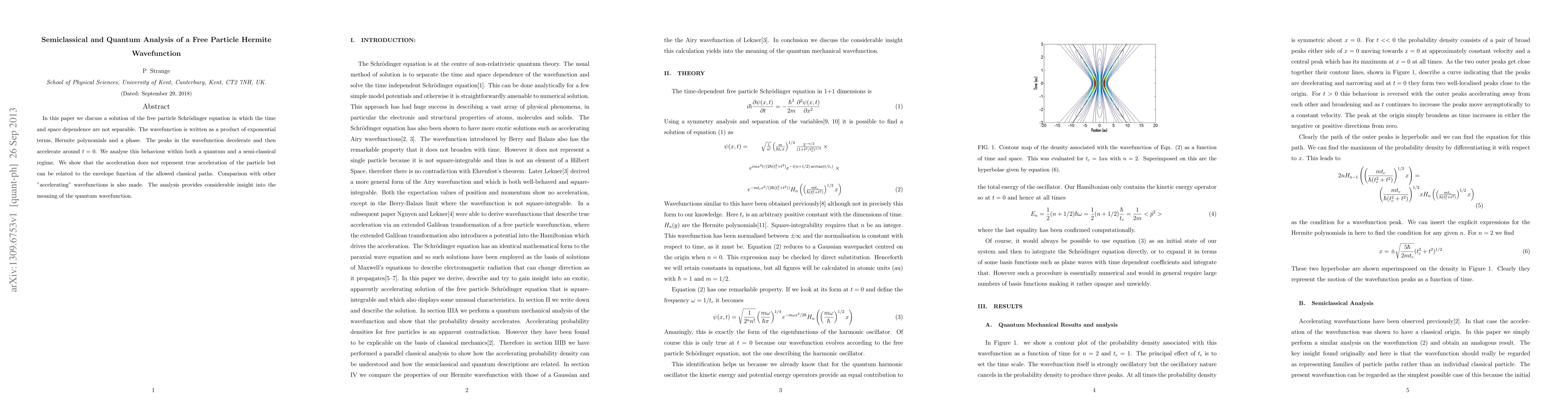 In this paper we discuss a solution of the free particle Schrodinger equation in which the time and space dependence are not separable. The wavefunction is written as a product of exponential terms, Hermite polynomials and a phase. The peaks in the wavefunction decelerate and then accelerate around t = 0. We analyse this behaviour within both a quantum and a semi-classical regime. We show that the acceleration does not represent true acceleration of the particle but can be related to the envelope function of the allowed classical paths. Comparison with other "accelerating" wavefunctions is also made. The analysis provides considerable insight into the meaning of the quantum wavefunction.
