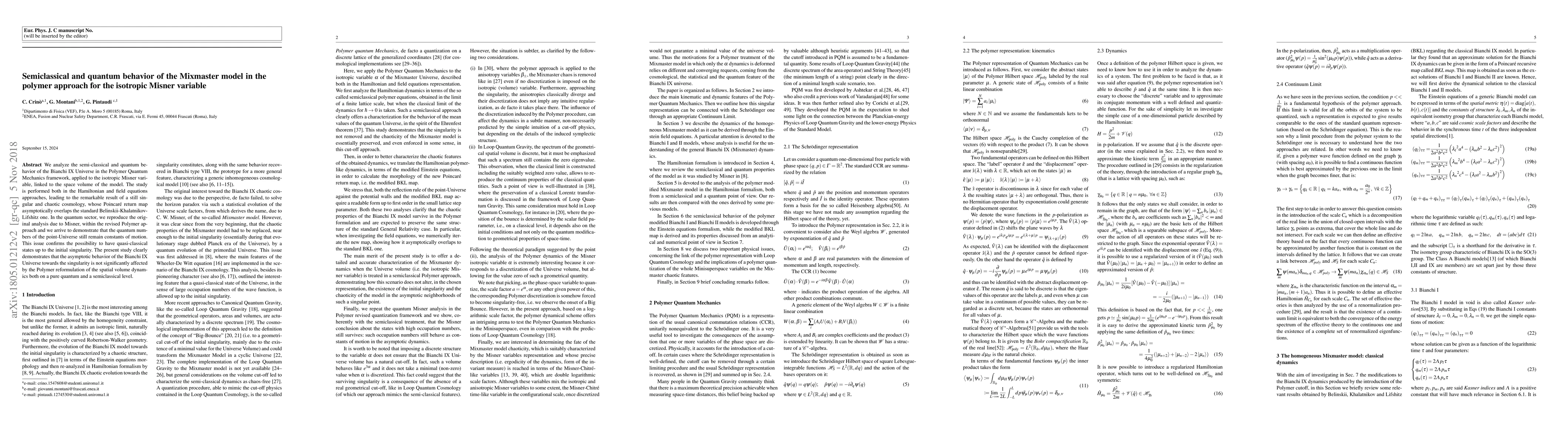 We analyze the semiclassical and quantum behavior of the Bianchi IX Universe in the Polymer Quantum Mechanics framework, applied to the isotropic Misner variable, linked to the space volume of the model. The study is performed both in the Hamiltonian and field equations approaches, leading to the surprising result of a still singular and chaotic cosmology, whose Poincar\'e return map asymptotically overlaps the standard Belinskii-Khalatnikov-Lifshitz one. In the quantum sector, we reproduce the original analysis due to Misner, within the revised Polymer approach and we arrive to demonstrate that the quantum numbers of the point-Universe still remain constants of motion. This issue confirms the possibility to have quasi-classical states up to the initial singularity. The present study clearly demonstrates that the asymptotic behavior of the Bianchi IX Universe towards the singularity is not significantly affected by the Polymer reformulation of the spatial volume dynamics both on a pure quantum and a semiclassical level.