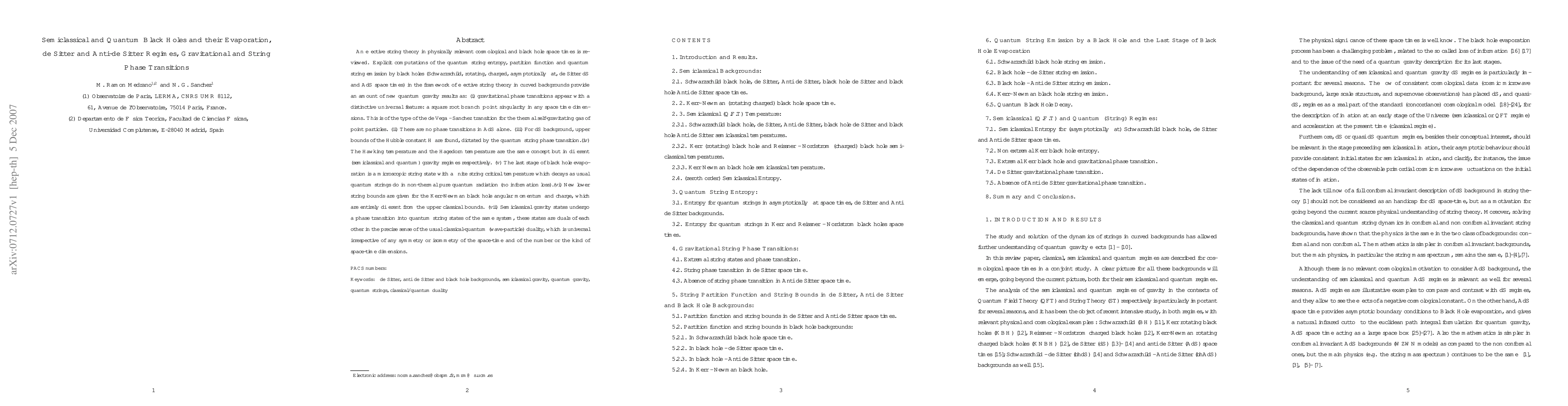 An effective string theory in physically relevant cosmological and black hole space times is reviewed. Explicit computations of the quantum string entropy, partition function and quantum string emission by black holes (Schwarzschild, rotating, charged, asymptotically flat, de Sitter dS and AdS space times) in the framework of effective string theory in curved backgrounds provide an amount of new quantum gravity results as: (i) gravitational phase transitions appear with a distinctive universal feature: a square root branch point singularity in any space time dimensions. This is of the type of the de Vega - Sanchez transition for the thermal self-gravitating gas of point particles. (ii) There are no phase transitions in AdS alone. (iii) For $dS$ background, upper bounds of the Hubble constant H are found, dictated by the quantum string phase transition.(iv) The Hawking temperature and the Hagedorn temperature are the same concept but in different (semiclassical and quantum) gravity regimes respectively. (v) The last stage of black hole evaporation is a microscopic string state with a finite string critical temperature which decays as usual quantum strings do in non-thermal pure quantum radiation (no information loss).(vi) New lower string bounds are given for the Kerr-Newman black hole angular momentum and charge, which are entirely different from the upper classical bounds. (vii) Semiclassical gravity states undergo a phase transition into quantum string states of the same system, these states are duals of each other in the precise sense of the usual classical-quantum (wave-particle) duality, which is universal irrespective of any symmetry or isommetry of the space-time and of the number or the kind of space-time dimensions.