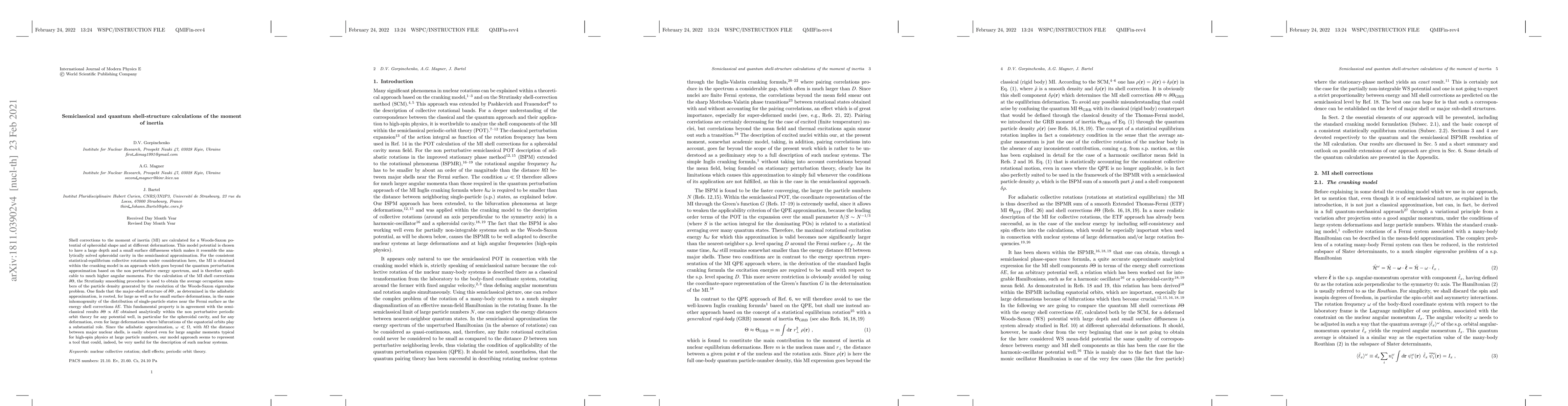 Shell corrections to the moment of inertia (MI) are calculated for a Woods-Saxon potential of spheroidal shape and at different deformations. This model potential is chosen to have a large depth and a small surface diffuseness which makes it resemble the analytically solved spheroidal cavity in the semiclassical approximation. For the consistent statistical-equilibrium collective rotations, the MI is obtained within the cranking model in an approach which goes beyond the quantum perturbation approximation based on the non perturbative energy spectrum. For the calculation of the MI shell corrections $\delta \Theta$, the Strutinsky smoothing procedure is used to obtain the average occupation numbers of the particle density generated by the resolution of the Woods-Saxon eigenvalue problem. One finds that the major-shell structure of $\delta \Theta$, as determined in the adiabatic approximation, is rooted, for large as well as for small surface deformations, in the same inhomogenuity of the distribution of single-particle states near the Fermi surface as the energy shell corrections $\delta E$. This fundamental property is in agreement with the semiclassical results $\delta \Theta \propto \delta E$ obtained analytically within the non perturbative periodic orbit theory for any potential well, in particular for the spheroidal cavity, and for any deformation, even for large deformations where bifurcations of the equatorial orbits play a substantial role. Since the adiabatic approximation, $\omega \ll \Omega$, with $\hbar \Omega $ the distance between major nuclear shells, is easily obeyed even for large angular momenta typical for high-spin physics at large particle numbers, our model approach seems to represent a tool that could be useful for the description of such nuclear systems.