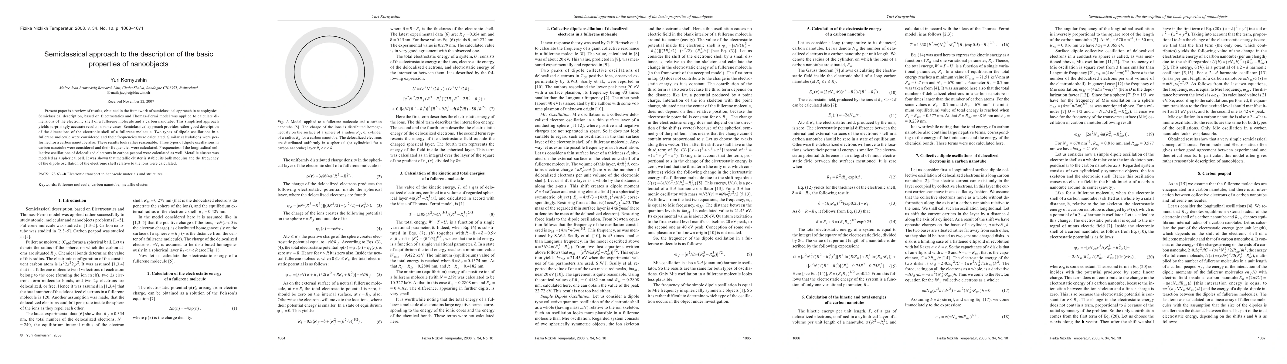 Present paper is a review of results, obtained in the framework of semiclassical approach in nanophysics. Semiclassical description, based on Electrostatics and Thomas-Fermi model was applied to calculate dimensions of the electronic shell of a fullerene molecule and a carbon nanotube. This simplified approach yields surprisingly accurate results in some cases. Semiclassical approach provides rather good description of the dimensions of the electronic shell of a fullerene molecule. Two types of dipole oscillations in a fullerene molecule were considered and their frequencies were calculated. Similar calculations were performed for a carbon nanotube also. These results look rather reasonable. Three types of dipole oscillations in carbon nanotube were considered and their frequencies were calculated. Frequencies of the longitudinal collective oscillations of delocalized electrons in carbon peapod were calculated as well. Metallic cluster was modeled as a spherical ball. It was shown that metallic cluster is stable; its bulk modulus and the frequency of the dipole oscillation of the electronic shell relative to the ions were calculated.