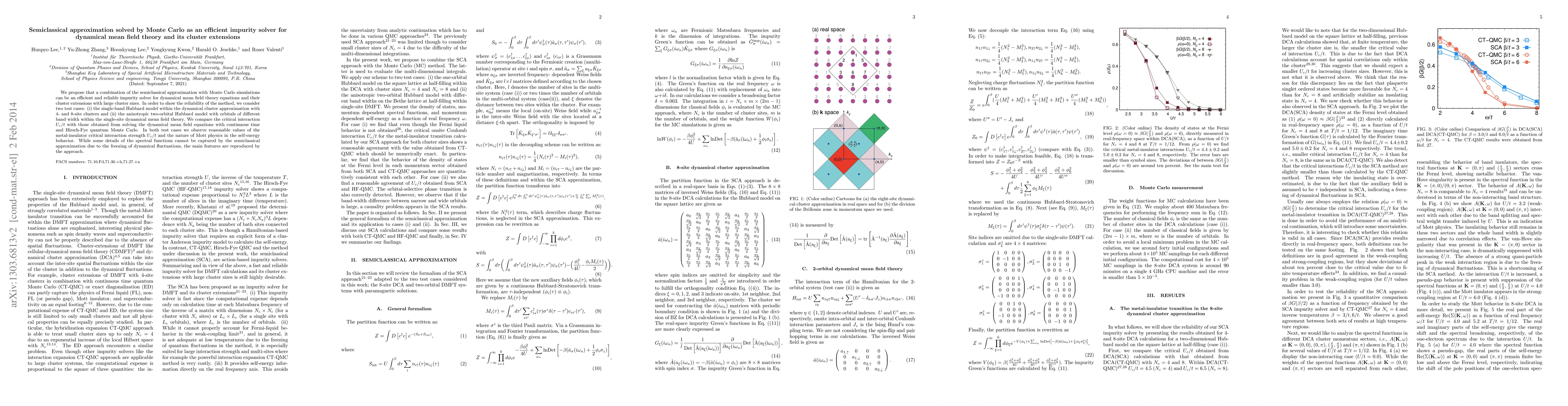 We propose that a combination of the semiclassical approximation with Monte Carlo simulations can be an efficient and reliable impurity solver for dynamical mean field theory equations and their cluster extensions with large cluster sizes. In order to show the reliability of the method, we consider two test cases: (i) the single-band Hubbard model within the dynamical cluster approximation with 4- and 8-site clusters and (ii) the anisotropic two-orbital Hubbard model with orbitals of different band width within the single-site dynamical mean field theory. We compare our results with those obtained from solving the dynamical mean field equations with continuous time and determinant quantum Monte Carlo. In both test cases we observe reasonable values of the metal-insulator critical interaction strength $U_c/t$ and, while some details of the spectral functions cannot be captured by the semiclassical approximation due to the freezing of dynamical fluctuations, the main features are reproduced by the approach.