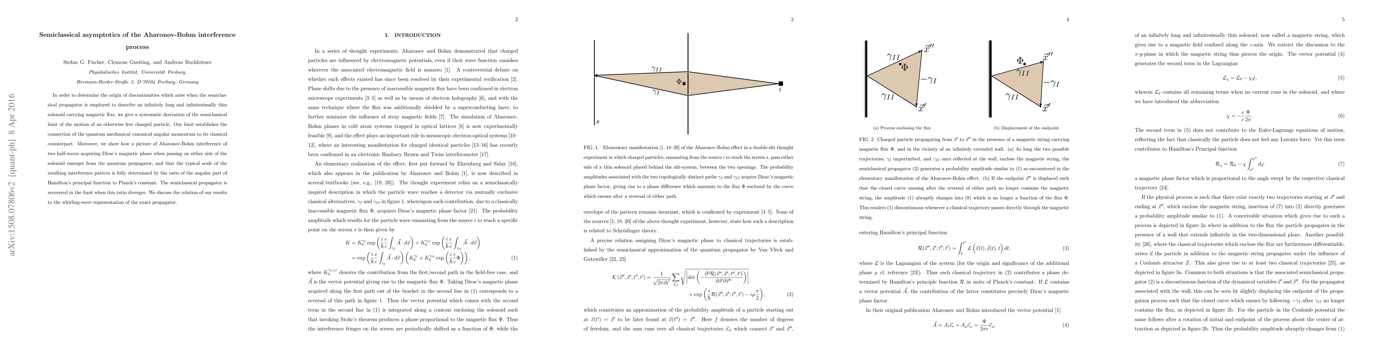 In order to determine the origin of discontinuities which arise when the semiclassical propagator is employed to describe an infinitely long and infinitesimally thin solenoid carrying magnetic flux, we give a systematic derivation of the semiclassical limit of the motion of an otherwise free charged particle. Our limit establishes the connection of the quantum mechanical canonical angular momentum to its classical counterpart. Moreover, we show how a picture of Aharonov-Bohm interference of two half-waves acquiring Dirac's magnetic phase when passing on either side of the solenoid emerges from the quantum propagator, and that the typical scale of the resulting interference pattern is fully determined by the ratio of the angular part of Hamilton's principal function to Planck's constant. The semiclassical propagator is recovered in the limit when this ratio diverges. We discuss the relation of our results to the whirling-wave representation of the exact propagator.
