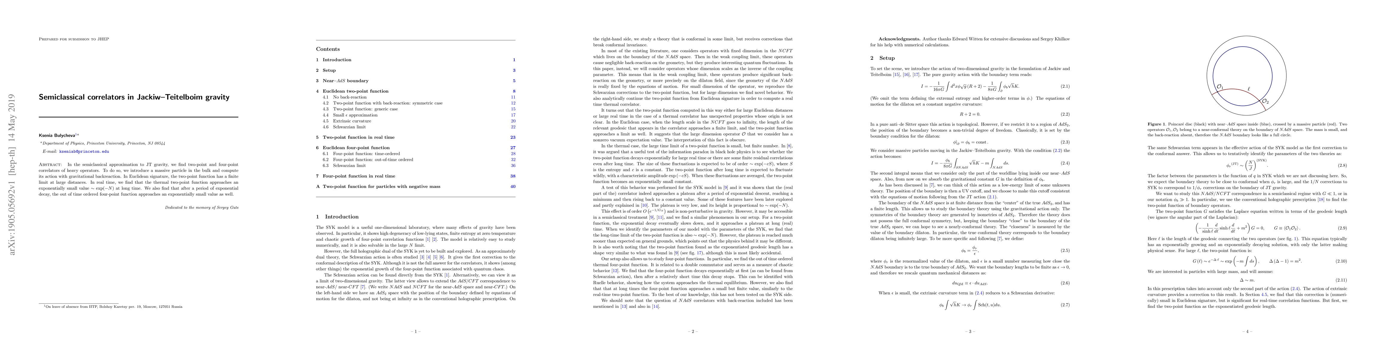 In the semiclassical approximation to JT gravity, we find two-point and four-point correlators of heavy operators. To do so, we introduce a massive particle in the bulk and compute its action with gravitational backreaction. In Euclidean signature, the two-point function has a finite limit at large distances. In real time, we find that the thermal two-point function approaches an exponentially small value $\sim \exp(-N)$ at long time. We also find that after a period of exponential decay, the out of time ordered four-point function approaches an exponentially small value as well.
