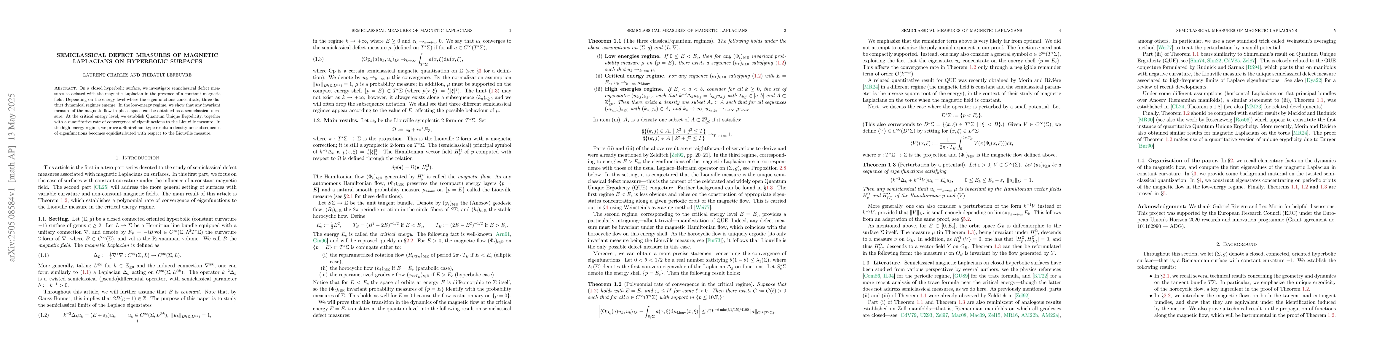 Development of semiclassical defect measures for magnetic Laplacians on hyperbolic surfaces, linking quantum eigenfunction behavior to classical dynamical systems.