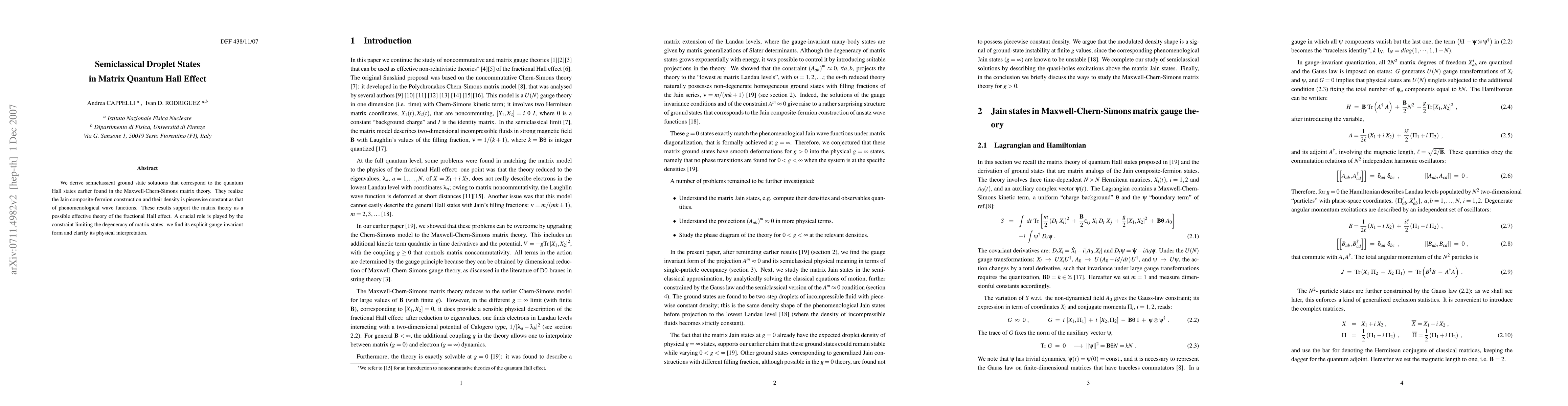 The research derives semiclassical droplet states aligning with quantum Hall states from Maxwell-Chern-Simons matrix theory, supporting matrix theory as an effective theory for fractional Hall effect, with a focus on a crucial gauge invariant constraint defining matrix state degeneracy.