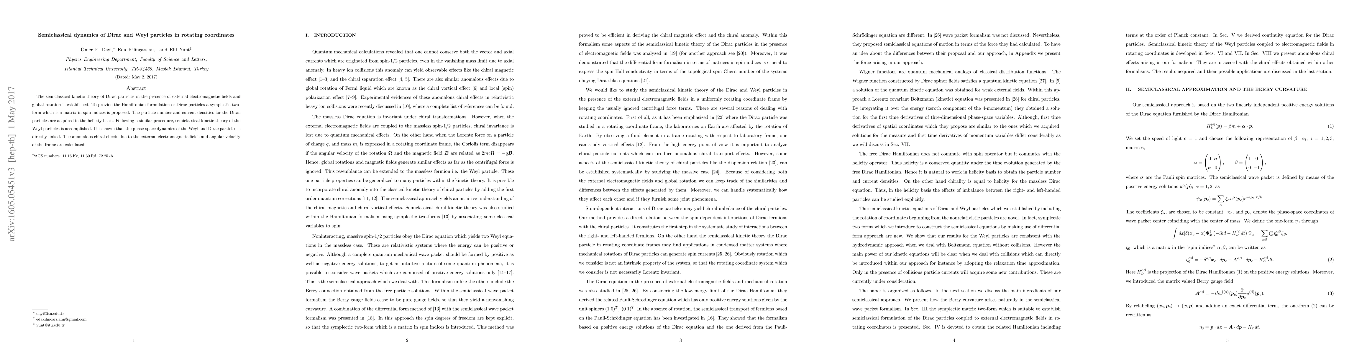 This paper establishes the semiclassical kinetic theory for Dirac and Weyl particles under external electromagnetic fields and global rotation, proposing a symplectic two-form for the Hamiltonian formulation. It calculates anomalous chiral effects and demonstrates the direct link between the phase-space dynamics of Weyl and Dirac particles.