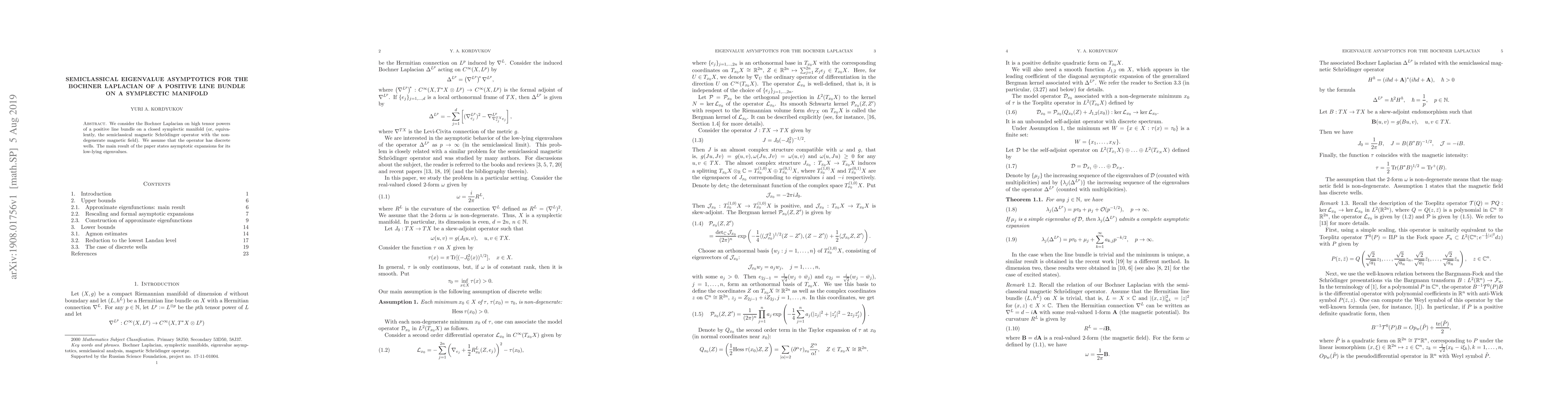 This paper investigates the Bochner Laplacian on high tensor powers of a positive line bundle on a closed symplectic manifold, focusing on its low-lying eigenvalues. The authors derive asymptotic expansions for these eigenvalues under the assumption of discrete wells.
