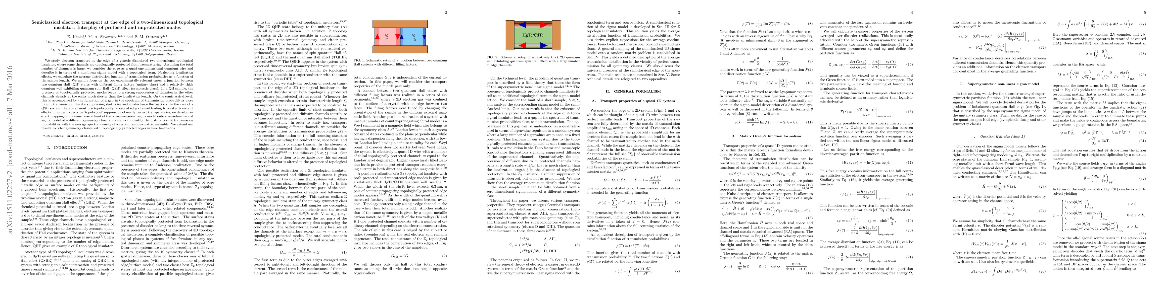 We study electron transport at the edge of a generic disordered two-dimensional topological insulator, where some channels are topologically protected from backscattering. Assuming the total number of channels is large, we consider the edge as a quasi-one-dimensional quantum wire and describe it in terms of a non-linear sigma model with a topological term. Neglecting localization effects, we calculate the average distribution function of transmission probabilities as a function of the sample length. We mainly focus on the two experimentally relevant cases: a junction between two quantum Hall (QH) states with different filling factors (unitary class) and a relatively thick quantum well exhibiting quantum spin Hall (QSH) effect (symplectic class). In a QH sample, the presence of topologically protected modes leads to a strong suppression of diffusion in the other channels already at the scales much shorter than the localization length. On the semiclassical level, this is accompanied by the formation of a gap in the spectrum of transmission probabilities close to unit transmission, thereby suppressing shot noise and conductance fluctuations. In the case of a QSH system, there is at most one topologically protected edge channel leading to weaker transport effects. In order to describe `topological' suppression of nearly perfect transparencies, we develop an exact mapping of the semiclassical limit of the one-dimensional sigma model onto a zero-dimensional sigma model of a different symmetry class, allowing us to identify the distribution of transmission probabilities with the average spectral density of a certain random-matrix ensemble. We extend our results to other symmetry classes with topologically protected edges in two dimensions.