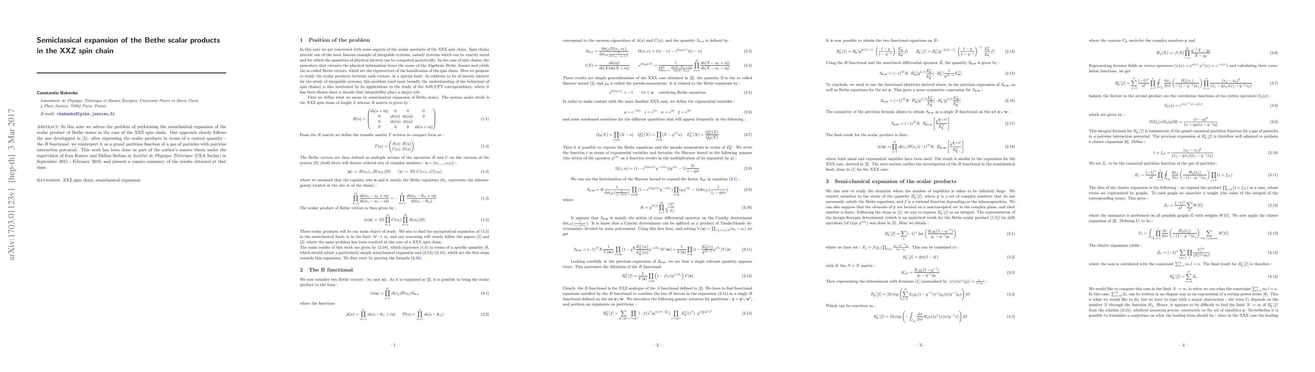 In this note we adress the problem of performing the semiclassical expansion of the scalar product of Bethe states in the case of the XXZ spin chain. Our approach closely follows the one developped in [1]: after expressing the scalar products in terms of a central quantity - the B functional, we reinterpret it as a grand partition function of a gas of particles with pairwise interaction potential. This work has been done as part of the author's master thesis under the supervision of Ivan Kostov and Didina Serban at Institut de Physique Th\'eorique (CEA Saclay) in September 2015 - February 2016, and present a consice summary of the results obtained at that time.